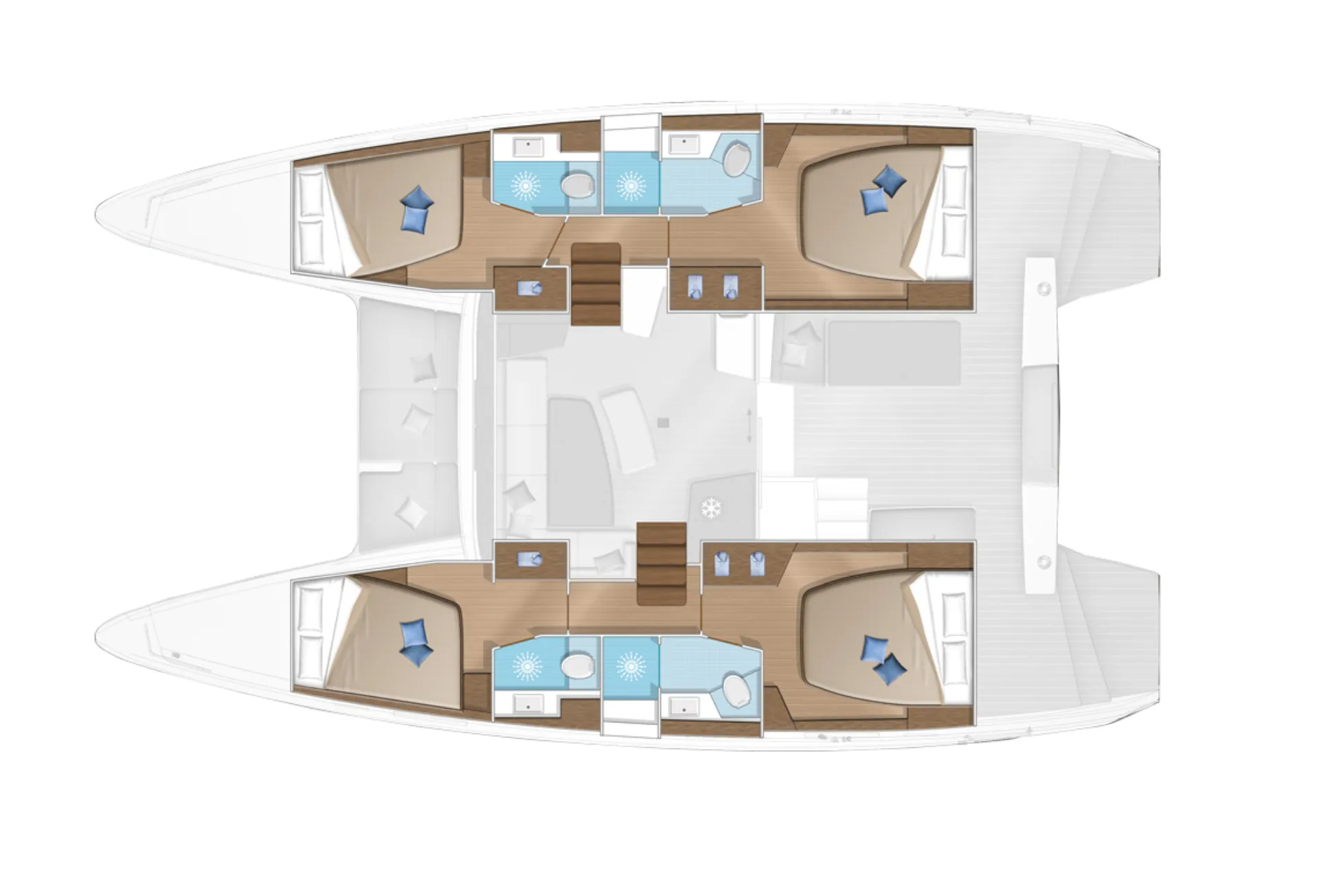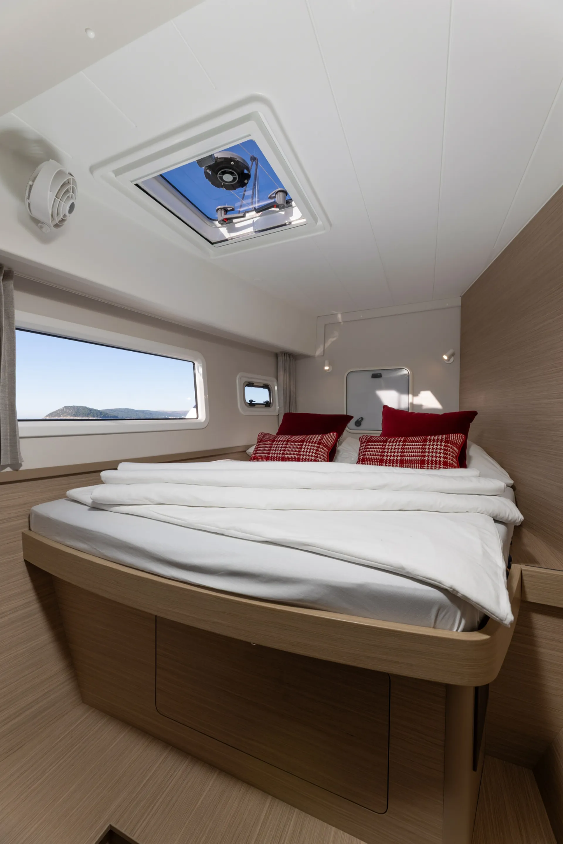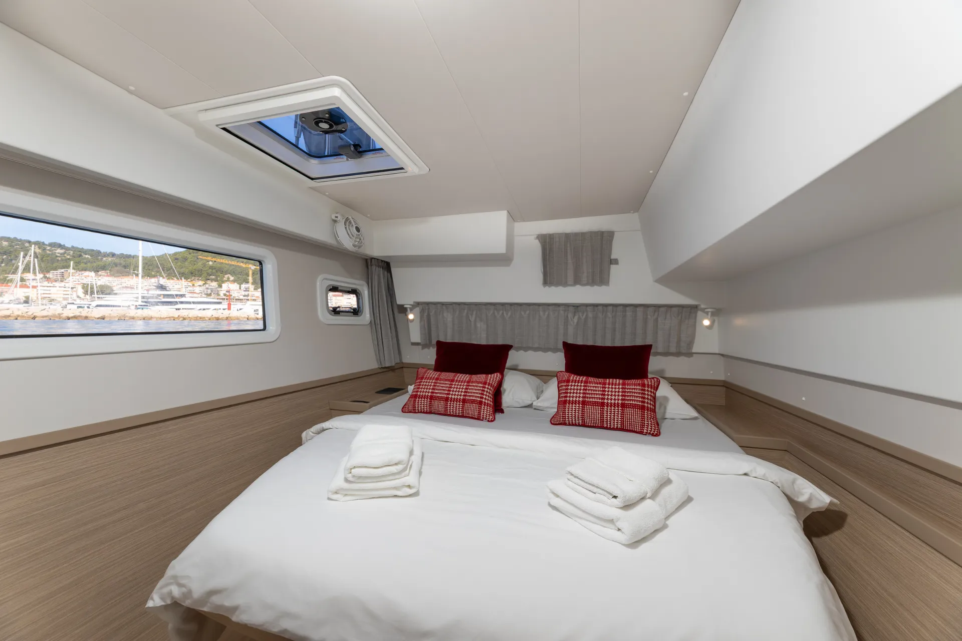 This catamaran offers smooth sailing experience thanks to essential features like generator and autopilot. SAX IV accommodates up to 12 guests, across 4 double cabins with en-suite bathrooms for maximum comfort. Furthermore, a convertible double berth in the saloon and two smaller crew cabins in the bow ensure ample room for relaxation and unwinding.