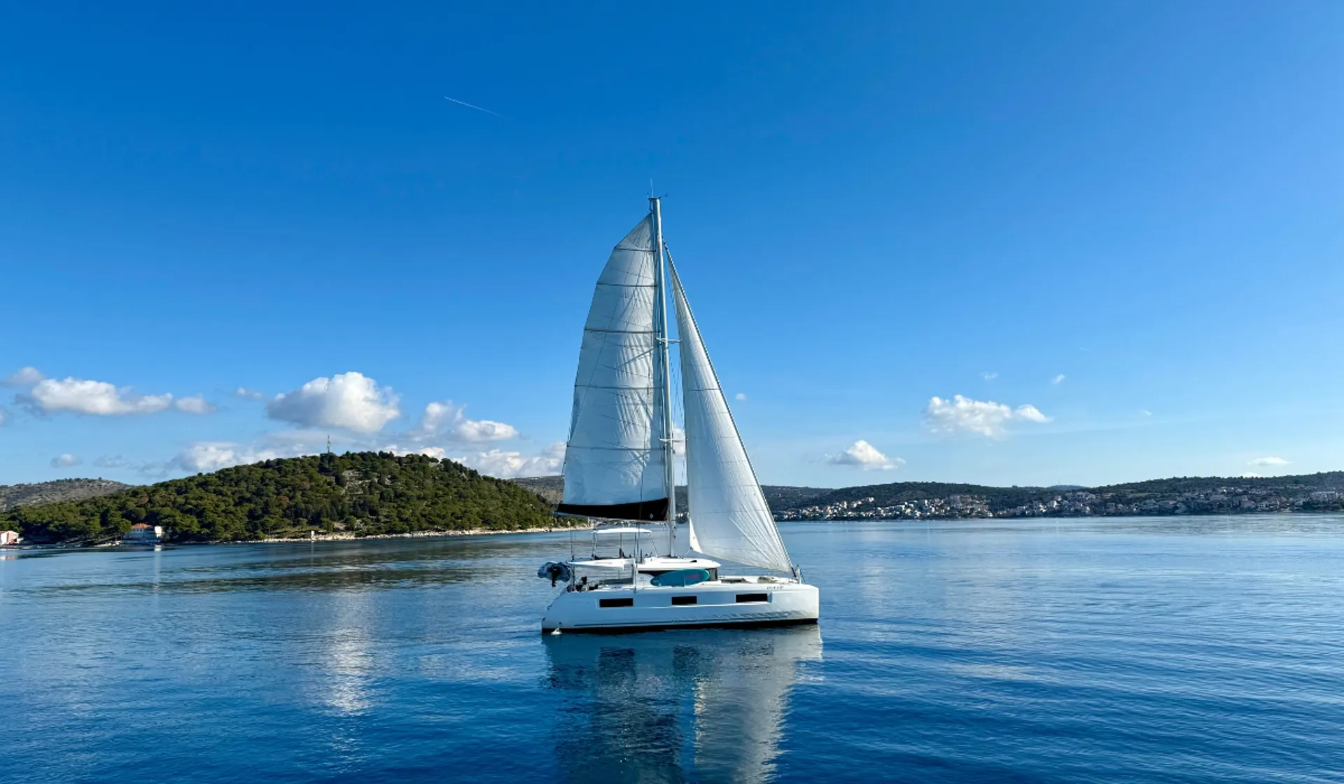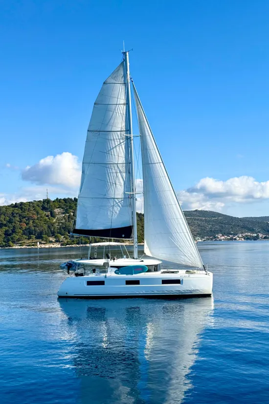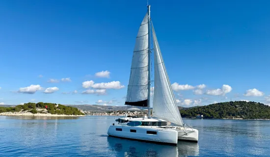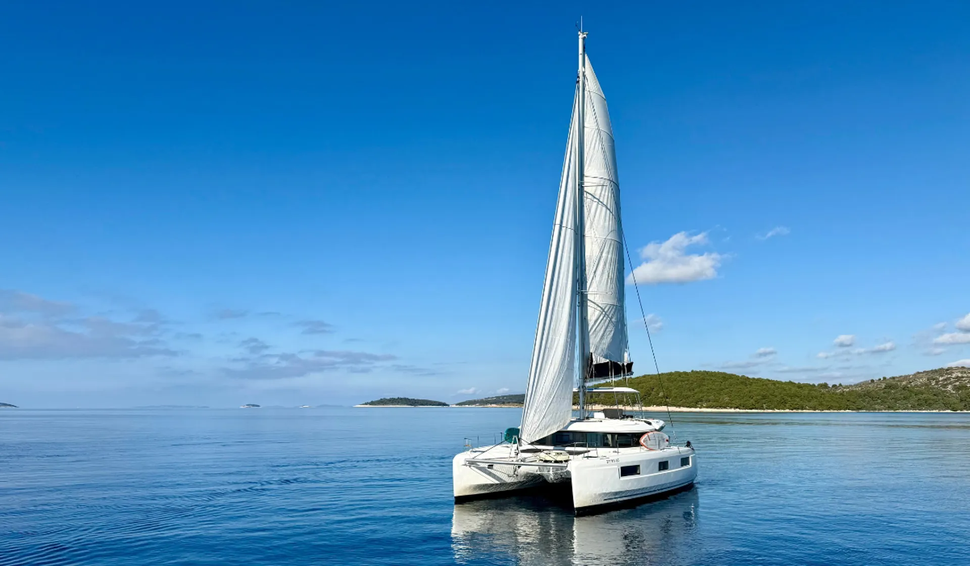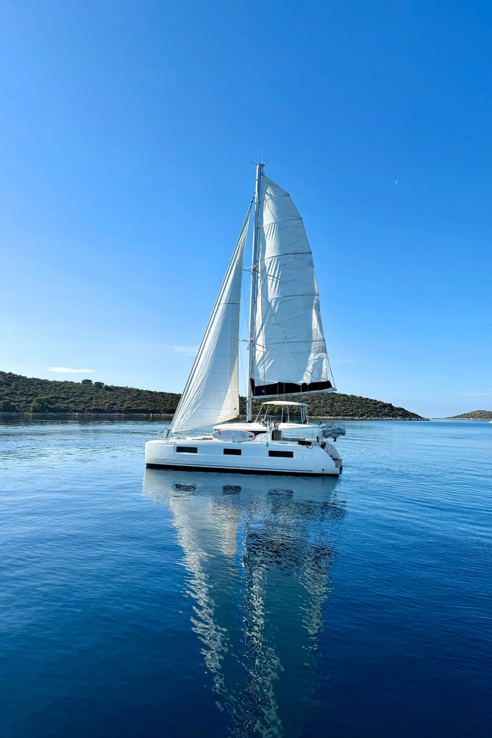 Zur Ausstattung dieses Katamarans gehören Autopilot, Standard-Großsegel, TV, WLAN, Cockpit-Lautsprecher, Heizung und Cockpit-Dusche.