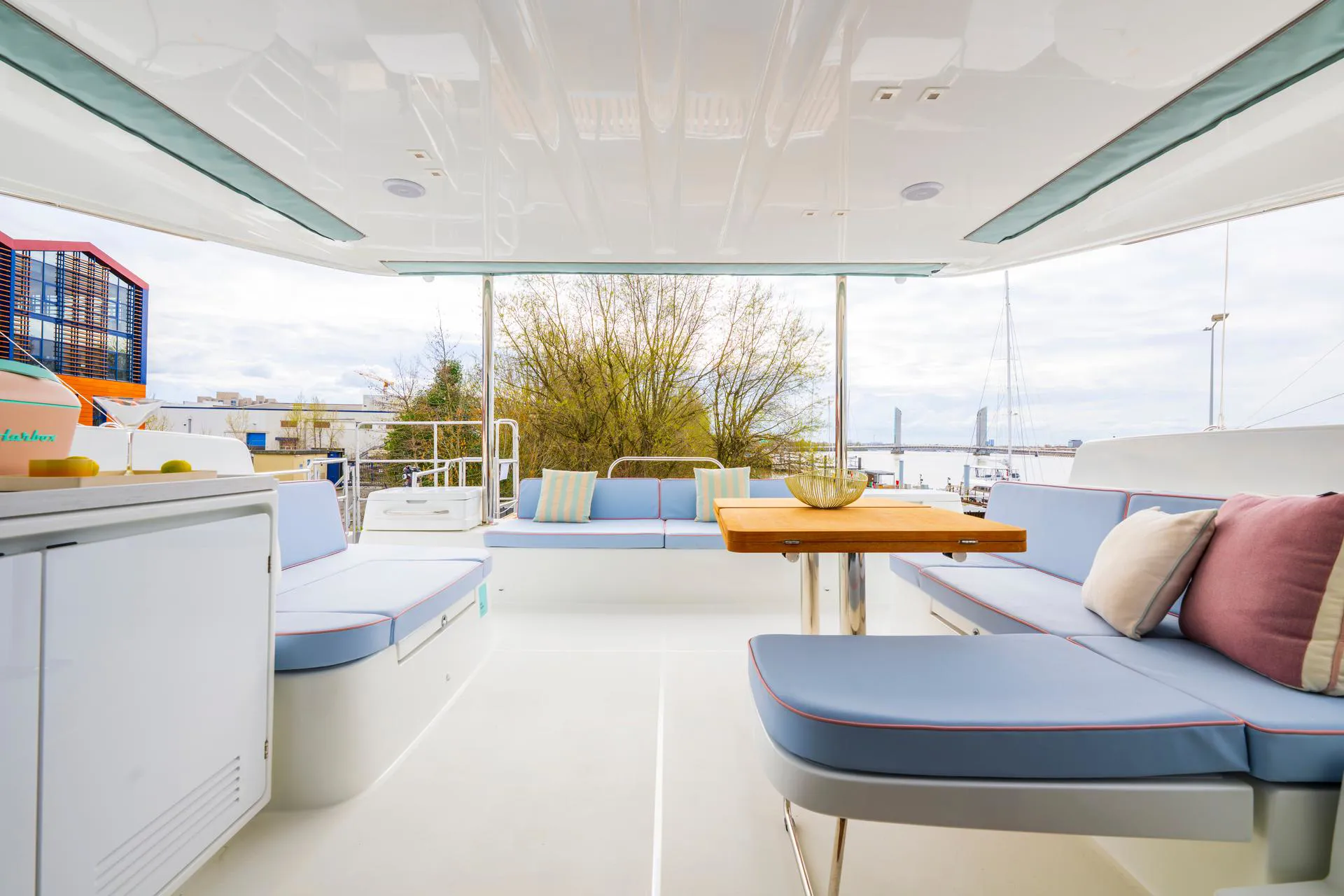 Die Lagoon 51 ist ein 15,35 m langer und 8,10 m breiter Segelkatamaran mit einem Tiefgang von nur 1,38 m. Diese Abmessungen garantieren großzügigen Wohnkomfort an Bord sowie den Zugang zu geschützten Buchten und flachen Ankerplätzen. Die Yacht bietet Platz für bis zu 10 Gäste in 4 Doppelkabinen mit jeweils eigenem Bad sowie 2 zusätzlichen Einzelkabinen im Inneren, die ideal für zwei Kinder oder einen Erwachsenen geeignet sind. Für den Skipper stehen im Bug eine separate Kabine und ein eigenes fünftes Bad zur Verfügung. Diese Raumaufteilung sorgt für ausreichend Privatsphäre und ist perfekt für größere Familien oder Gruppen von Freunden.