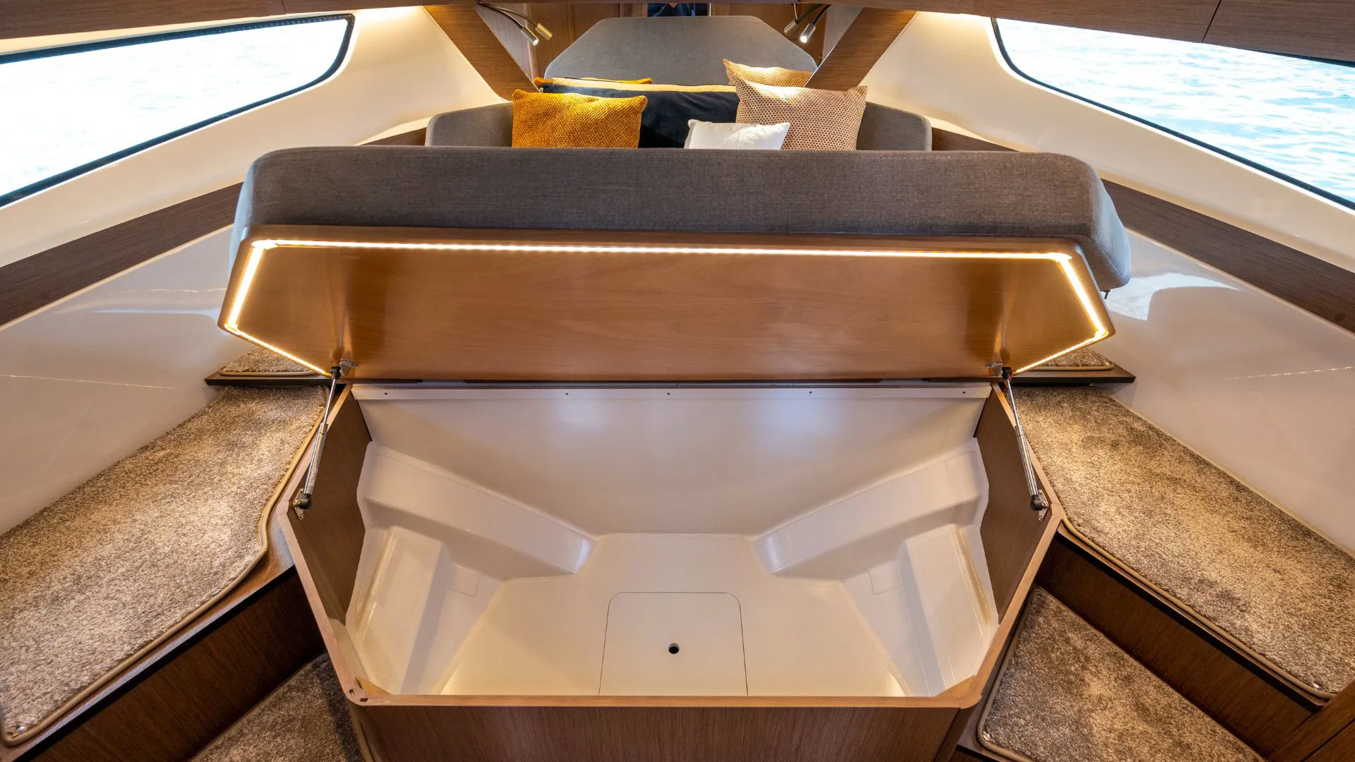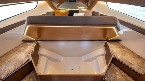 Vanjski prostor dodatno je unaprijeđen Pure paketom presvlaka s konvertibilnim sjedenjem u kokpitu, bočnom platformom koja otvara prostor i čini ga idealnim za druženje i uživanje. Tu je još L-salon, pramčano sunčalište s podesivim naslonom i tendom.
