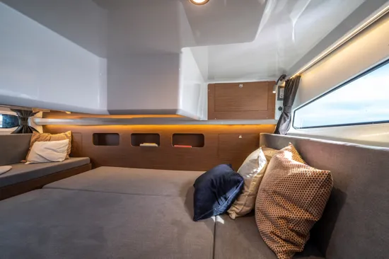 Unutrašnjost broda udobno prima do 7 osoba, s master kabinom, gostinskom kabinom s bračnim i jednokrevetnim ležajem te pretvorivim ležajem u salonu. Visokokvalitetni završni detalji, praktični spremnici i moderna oprema, uključujući klimatizaciju, hladnjake na flybridgeu i donjoj palubi te cijeli 220V električni krug, osiguravaju maksimalni komfor tijekom plovidbe.