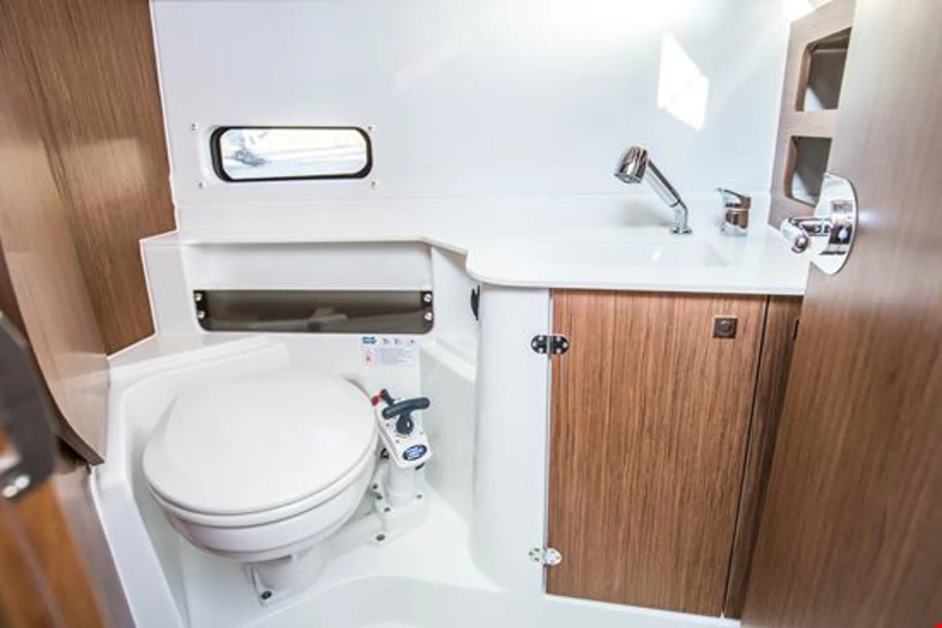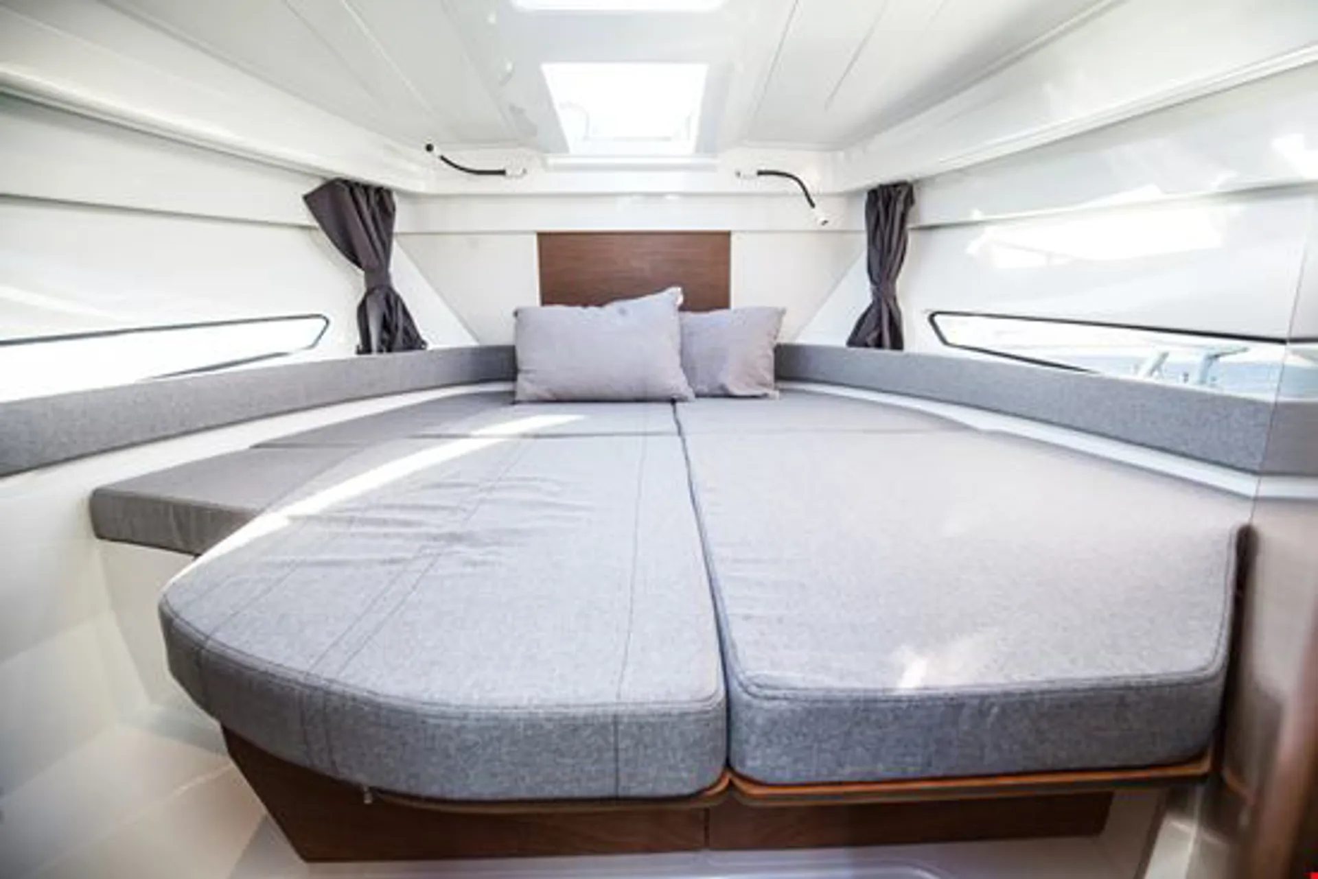 Prostrani kokpit pruža odlično mjesto za druženje, a pretvara se i u udobno sunčalište. U unutrašnjosti se nalazi moderno opremljena kuhinja, dodatni ležajevi, LED rasvjeta te praktičan električni WC, dok kabina nudi dovoljno prostora za ugodan boravak. Elegance presvlake i tikovina na kokpitu daju dodatnu dozu luksuza.