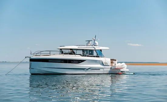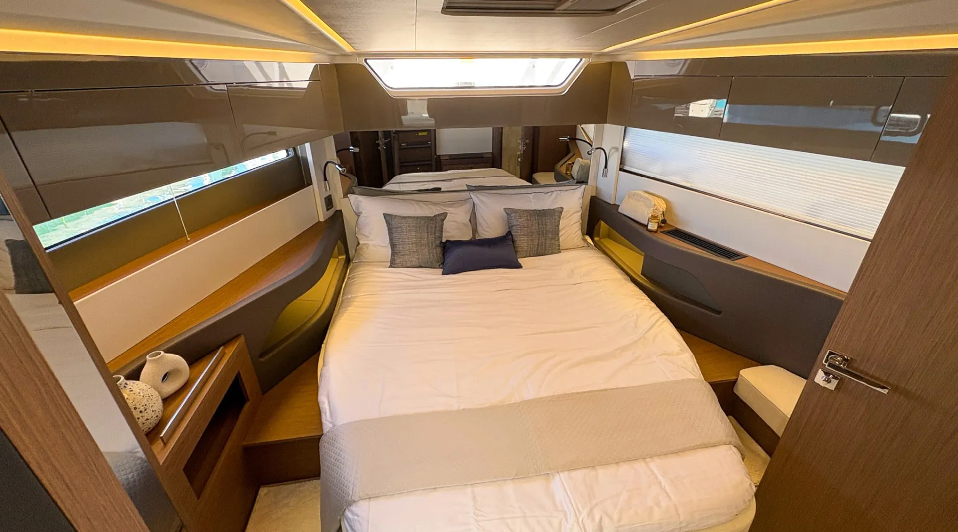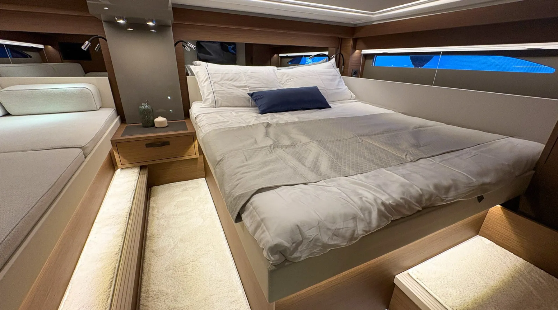 Unutrašnjost nudi potpuno klimatizirani salon. Kuhinjski blok opremljen je vitrokeramičkom pločom za kuhanje. Izbor je na vama objedovati u salonu ili na otvorenom u kokpitu, kojem bočne terase dodaju osjećaj prostranosti, povezanosti s morem. Prednji sunčališni ležaj s sklopivim stolom i tendom pruža idealan pogled na zalazak sunca. Ispod palube, dvije privatne kabine s vlastitim WC-ima i tuševima primaju do četiri osobe.