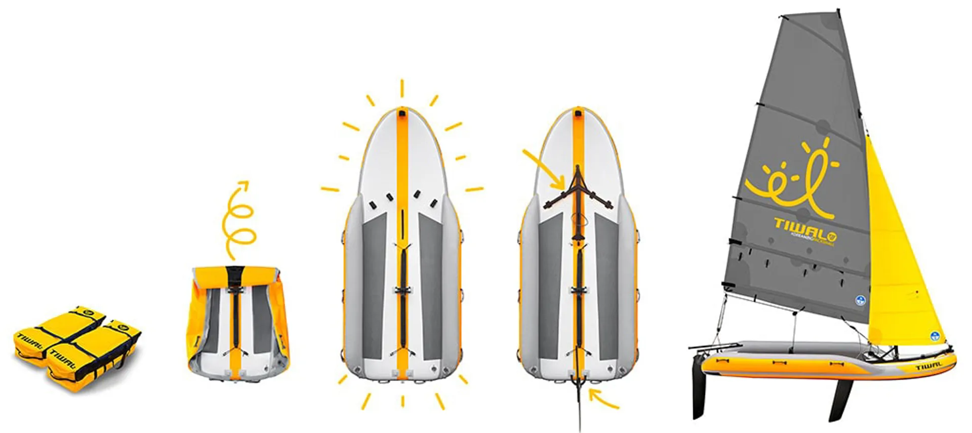Transport je izuzetno jednostavan – brod se sprema u dvije torbe koje stanu u prtljažnik automobila, ostavljajući dovoljno mjesta za obitelj i prtljagu. Sastavljanje je dio zabave: potrebno je spojiti samo šest dijelova, napuhati trup te montirati kormilo, peraju i jarbol s jedrima.