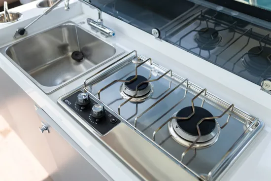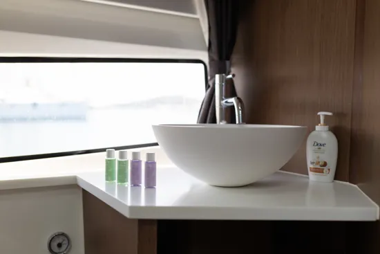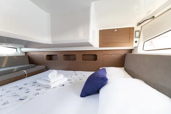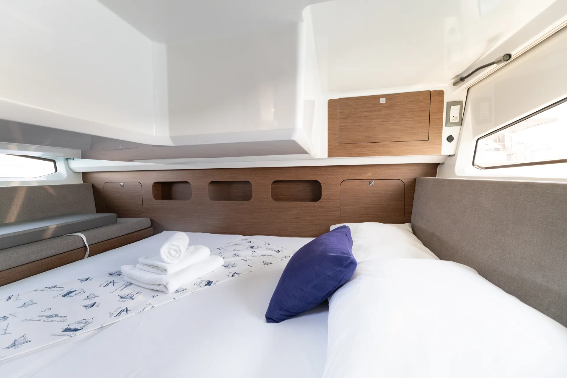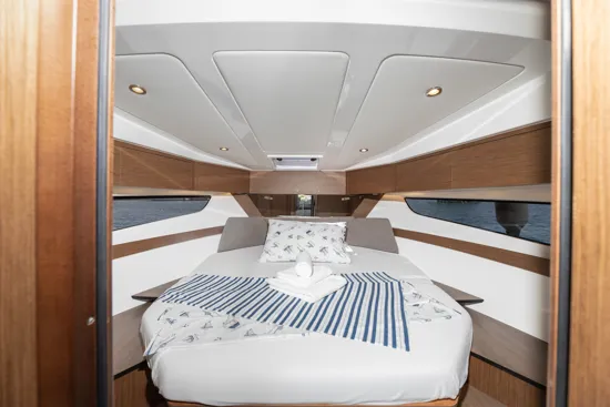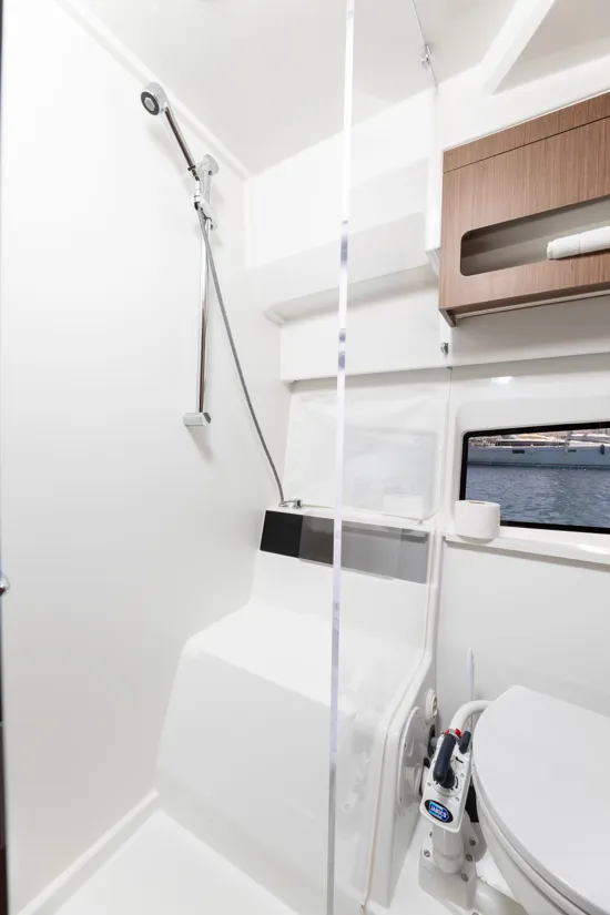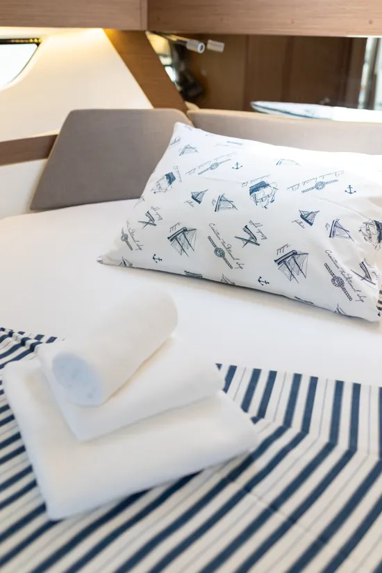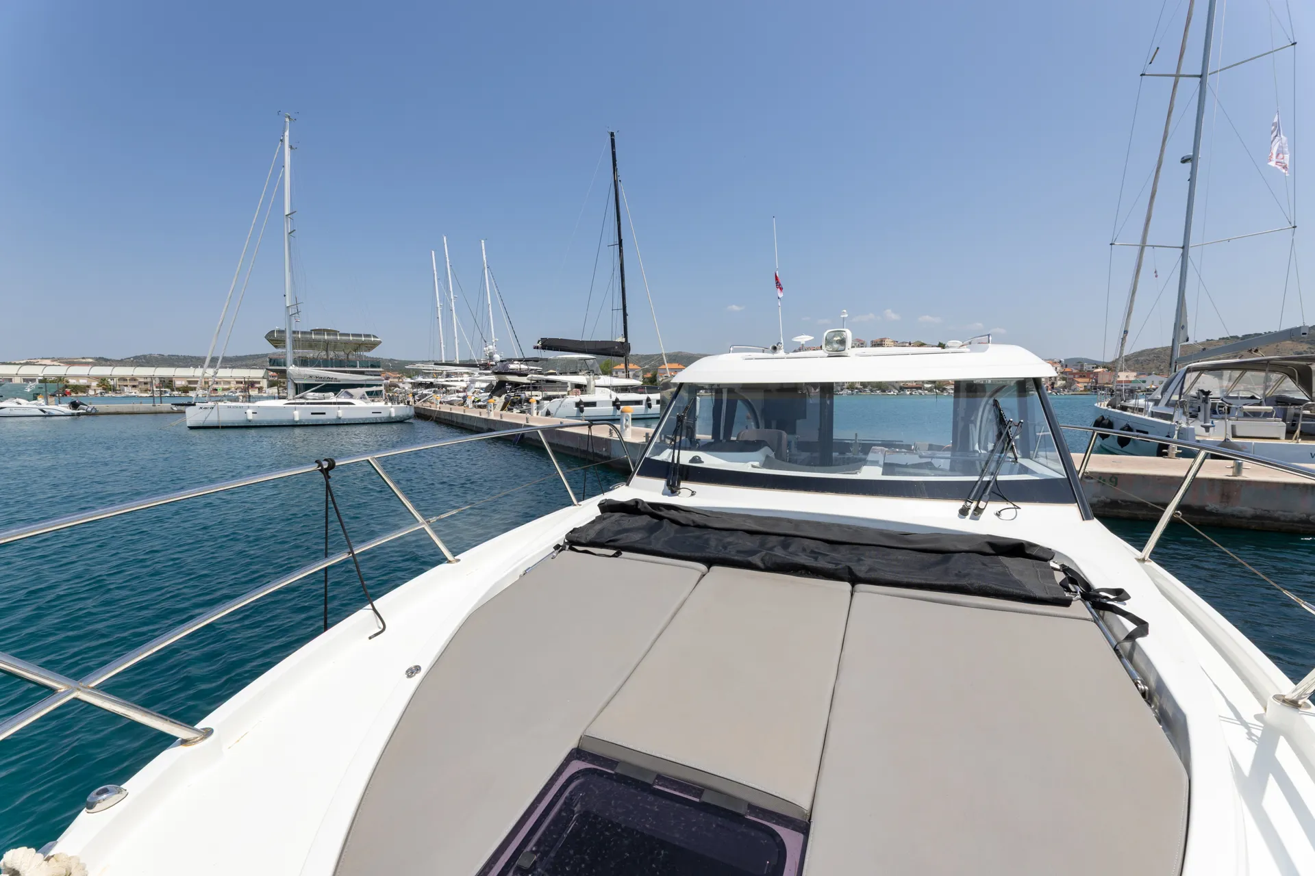 Palubna oprema je odlično specificirana : električno sidreno vitlo, pramčani propeler, produženim krmena platforma, podvodna rasvjeta, Flexi teak paluba, Minn Kota trolling motor i solarni paneli koji osiguravaju tihi i ekološki izvor energije za dulji boravak na sidru.