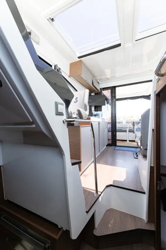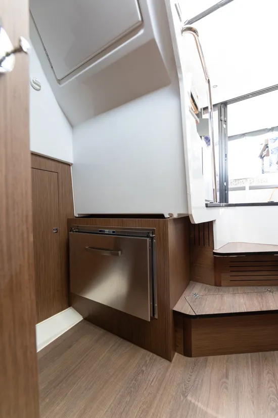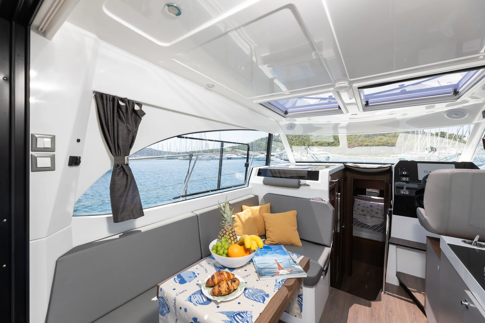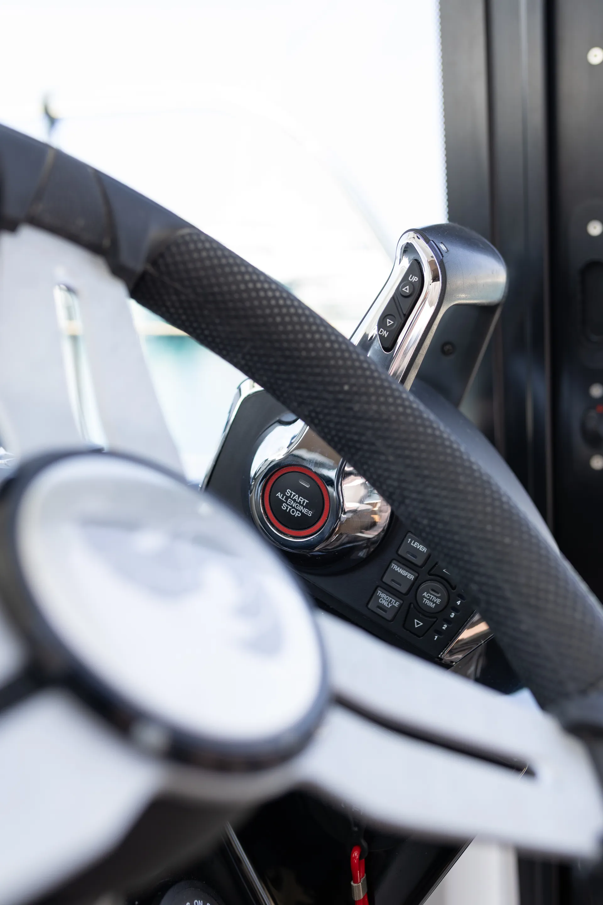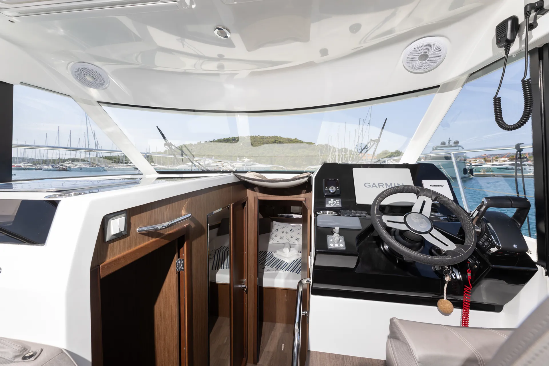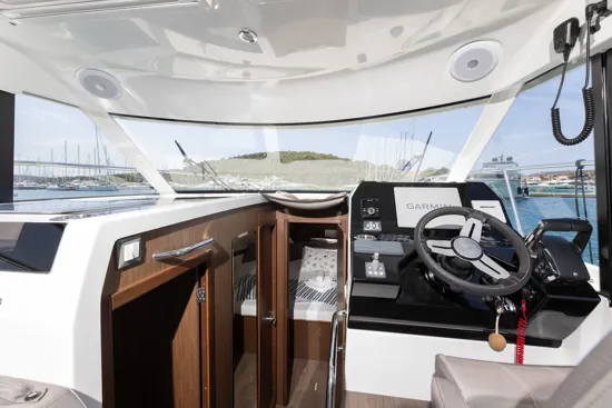 Navigacija uključuje Garmin GPSMAP 1223 XSV chartplotter sa sondom GT51, VHF 215, Zipwake trim tabove, a audio sustav čini Fusion stereo s unutarnjim i vanjskim zvučnicima.
