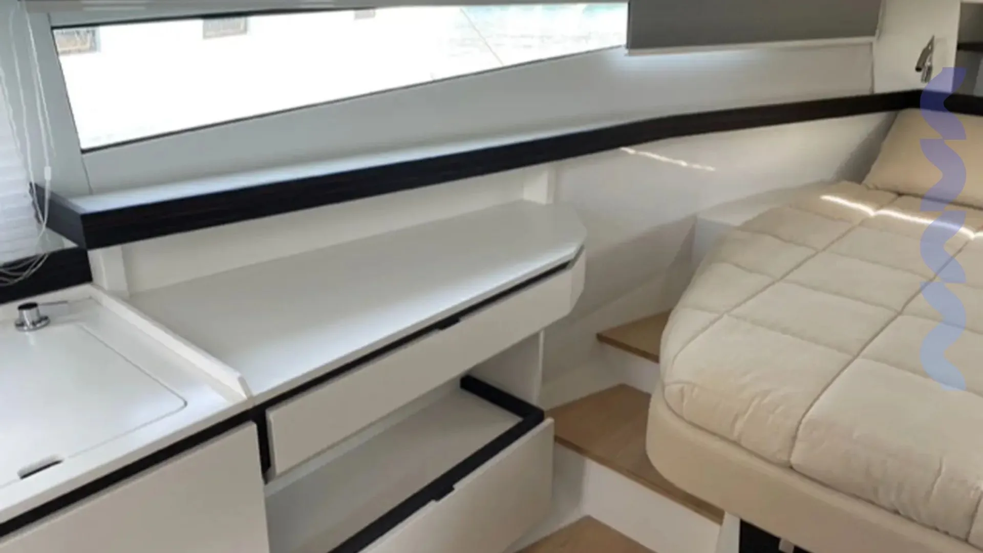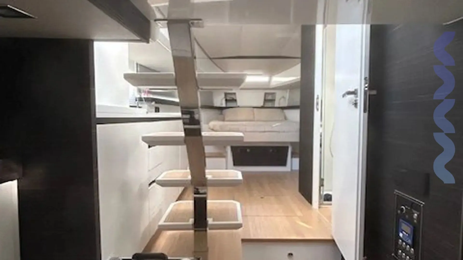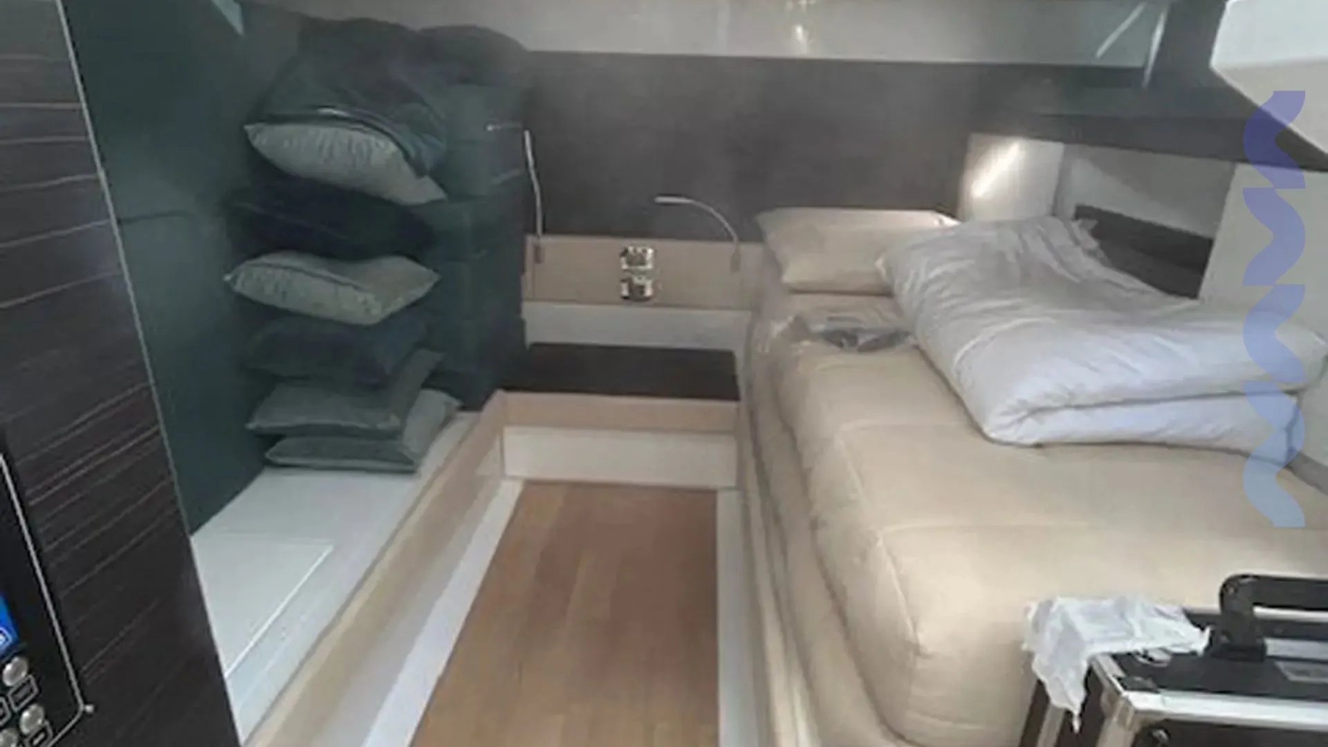 Unutrašnjost nudi master kabinu, sa prostranim kupatilom, gostinjsku kabinu s dva ležaja, potpuno opremljenu kuhinju (indukcijska ploča, hladnjak, mikrovalna), drveni pod, klimatizaciju, audio sustav i LCD TV.