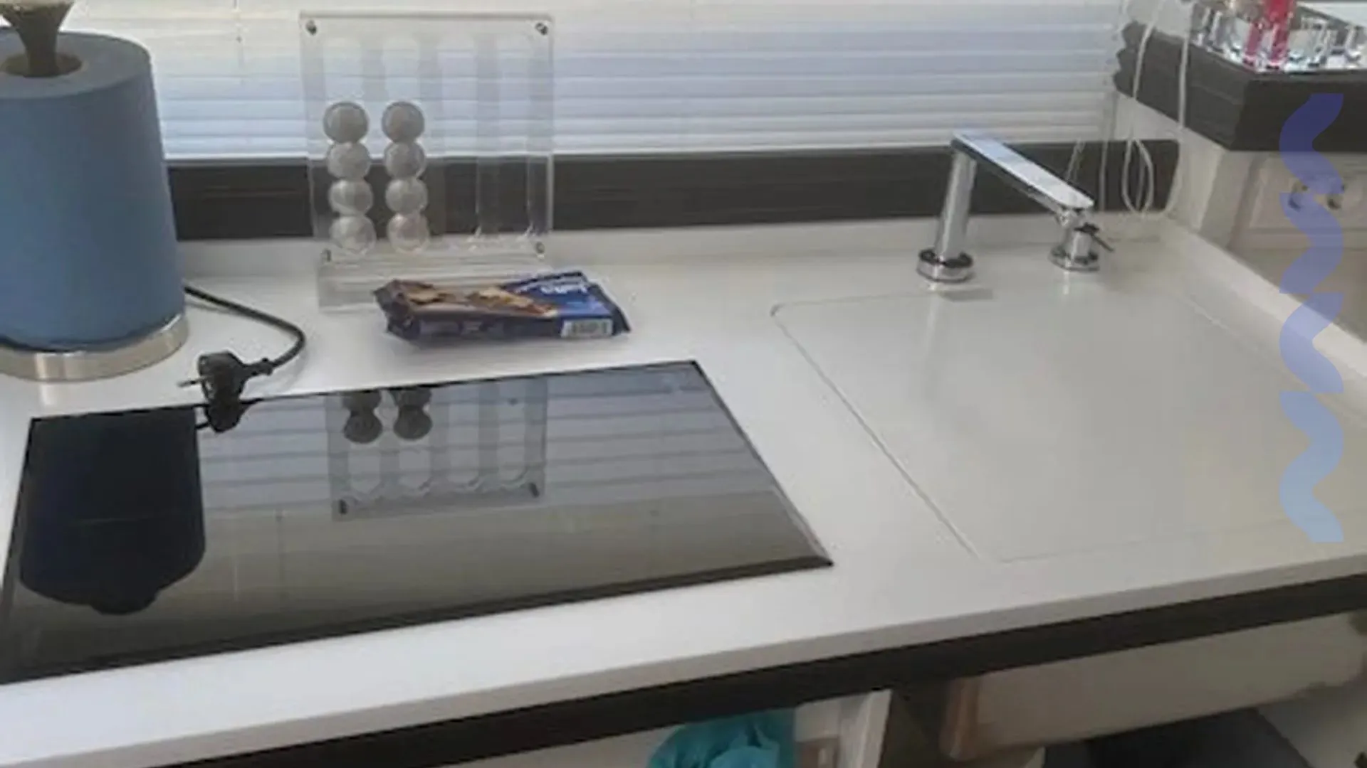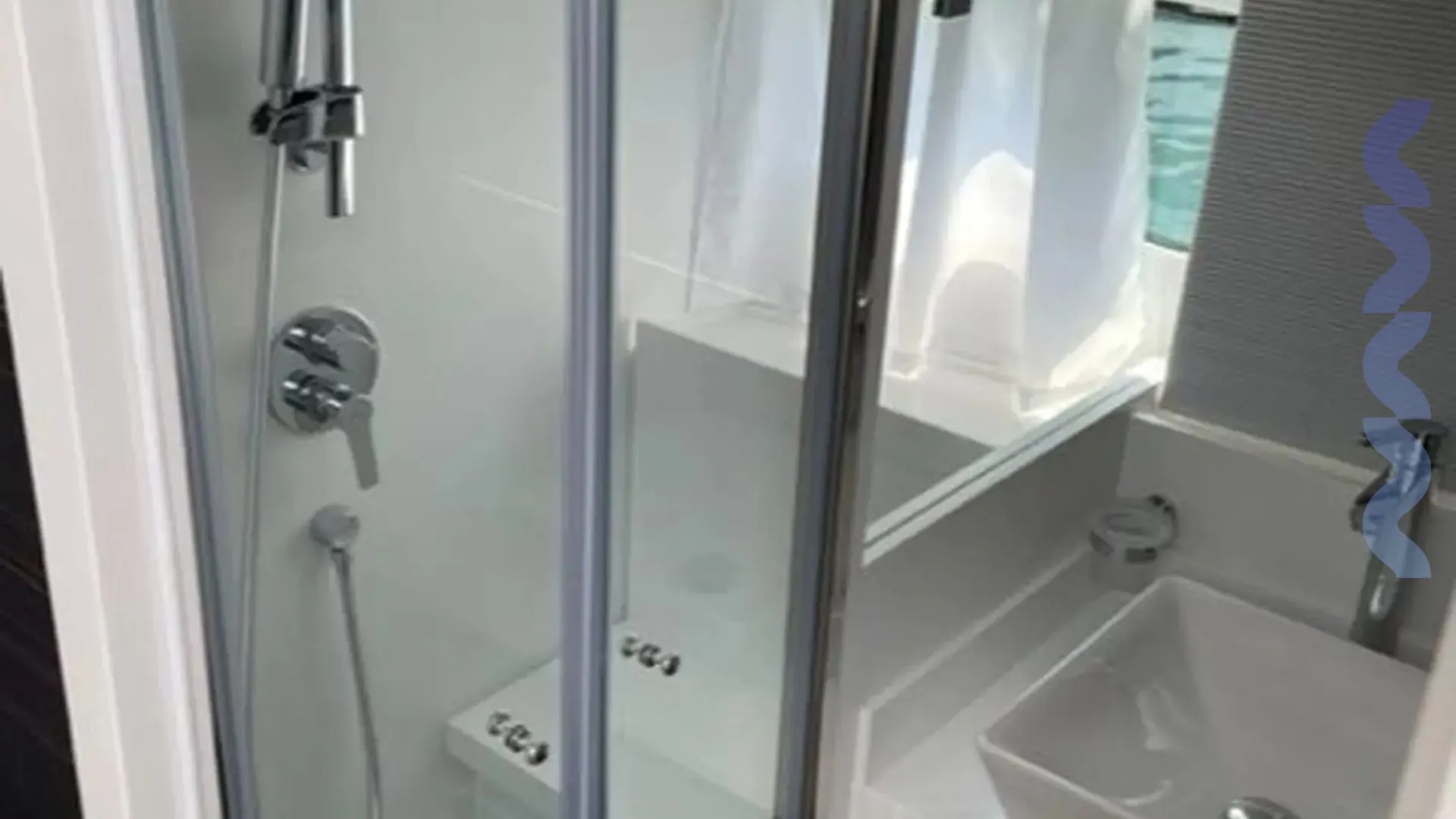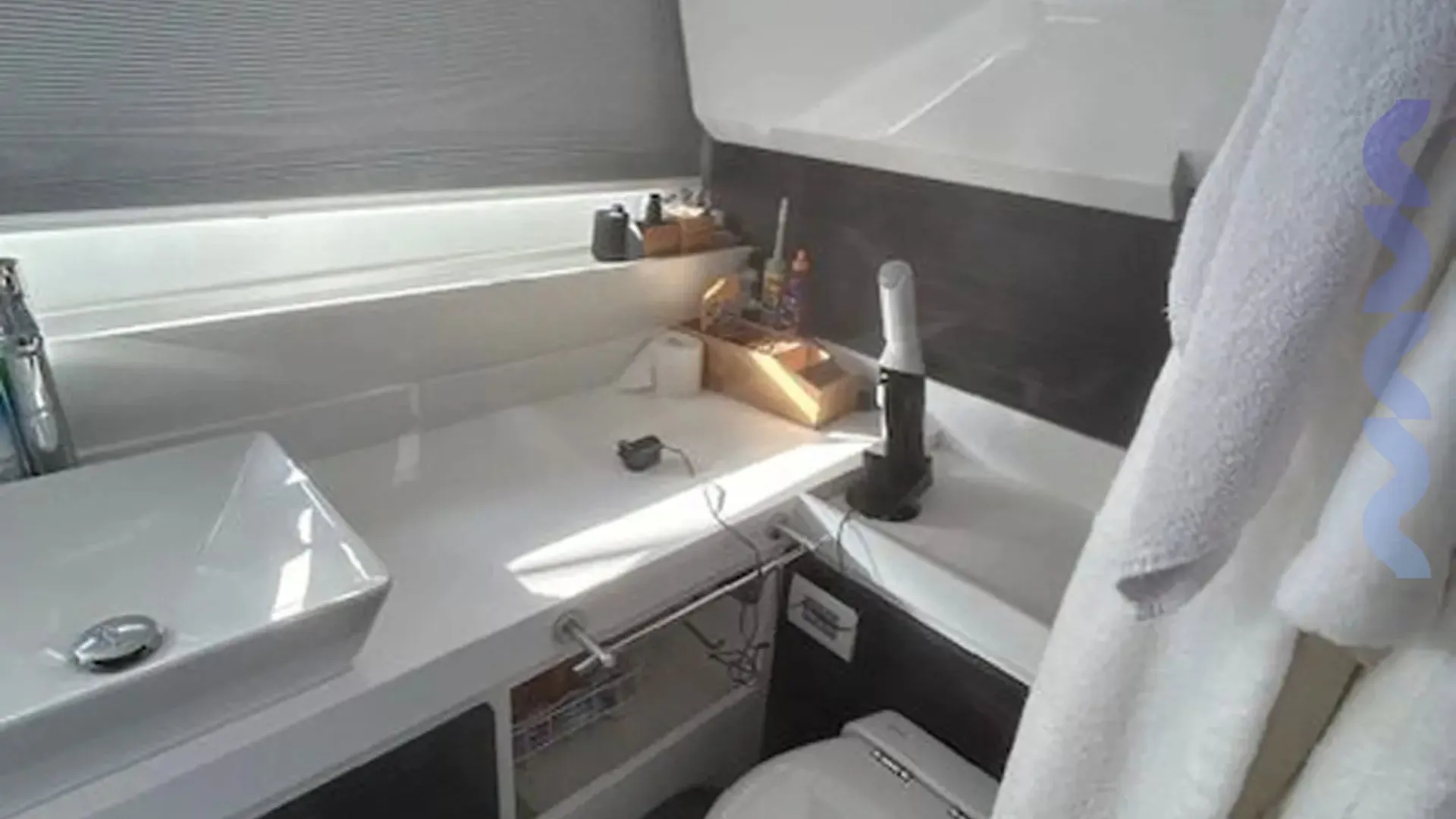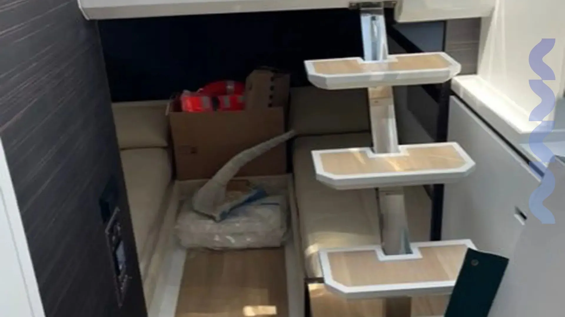 Unutrašnjost nudi master kabinu, sa prostranim kupatilom, gostinjsku kabinu s dva ležaja, potpuno opremljenu kuhinju (indukcijska ploča, hladnjak, mikrovalna), drveni pod, klimatizaciju, audio sustav i LCD TV.
