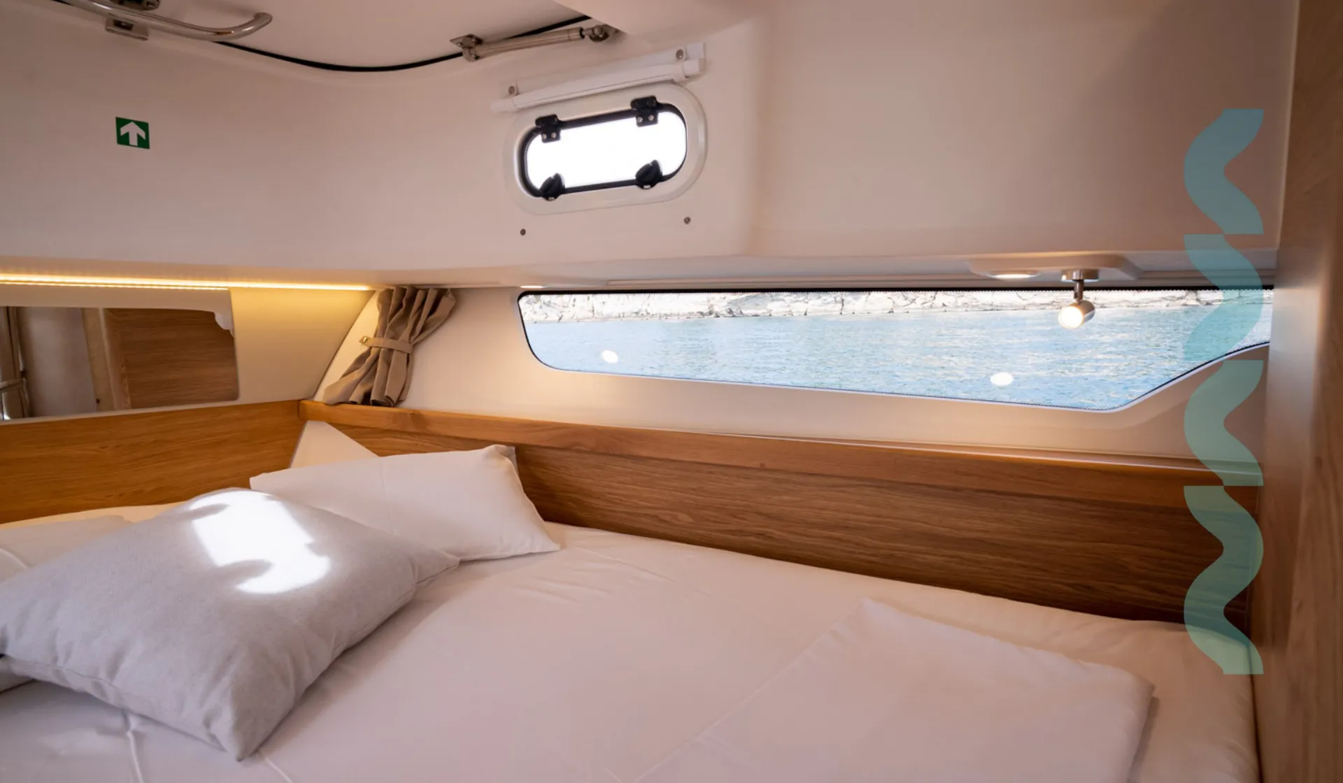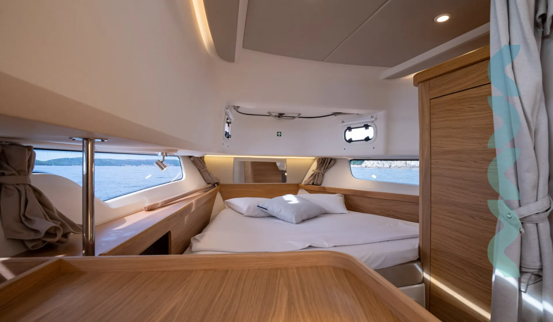 Inside, the boat offers two comfortable and well-designed cabins, sleeping up to 4 guests, along with a fully equipped bathroom with shower and a portable a/c unit.