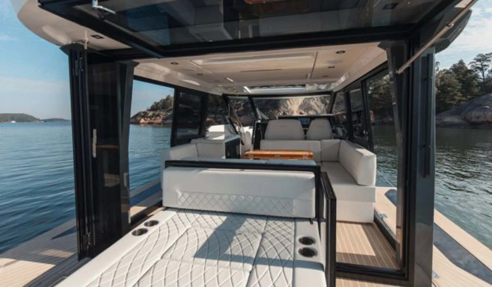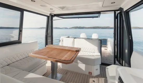 Udobje in prostornost so glavne značilnosti tega plovila: prostorna krmna kabina, steklena krmna vrata in prilagodljive možnosti sedenja ustvarjajo idealen prostor za druženje in sprostitev. Drsne bočne terase povežejo plovilo z morjem in dajejo občutek, kot da smo popolnoma potopljeni v modrino. Ležalniki na premcu in krmi omogočajo udobno sončenje. Dodatni hladilnik v krmarjevem prostoru in vrhunski JL Audio sistem poskrbita za zabavo na plovilu.