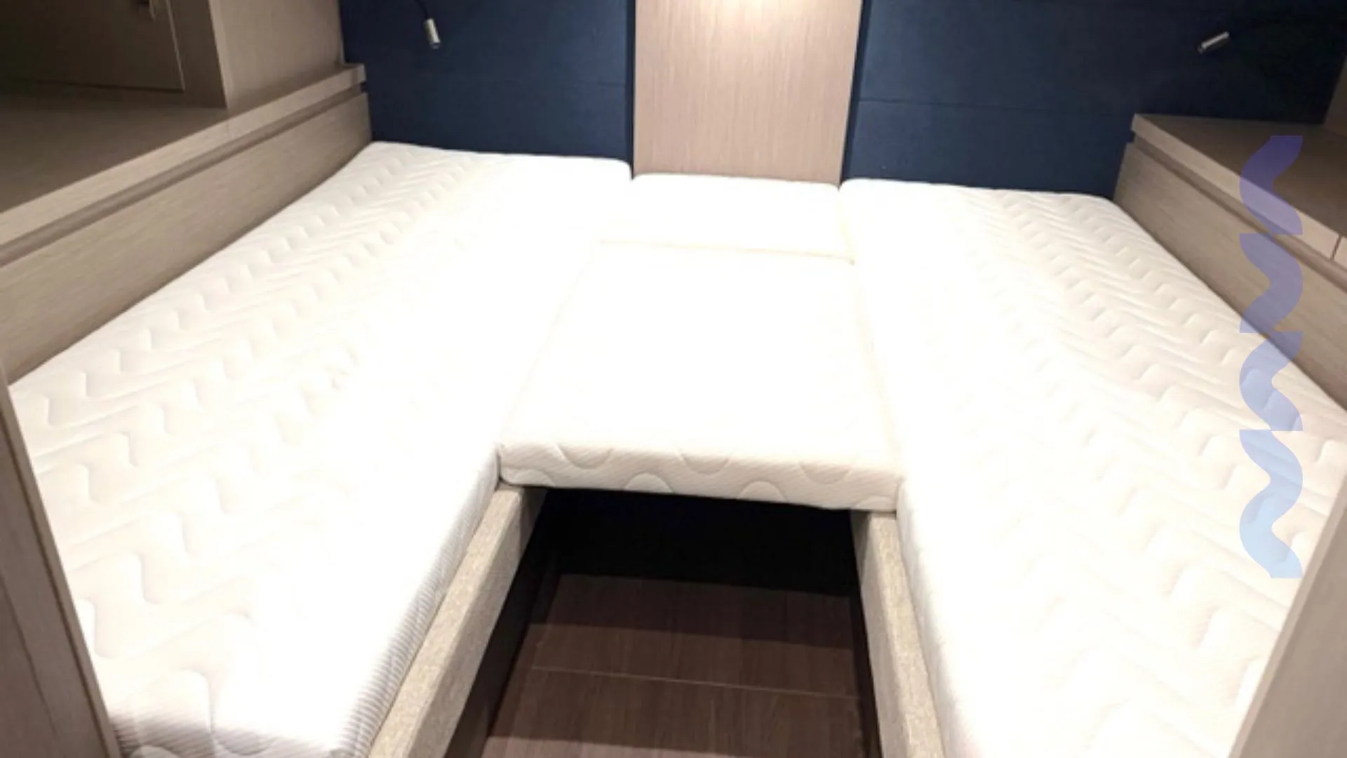 Notranjost v dekorju Alpi Grey Walnut Talisman Chinchilla in Bora Bora oblazinjenje v salonu ustvarjata eleganten ambient. Razpored vključuje dve dvoposteljni kabini in eno kopalnico, funkcionalno kuhinjo ter udoben salon.