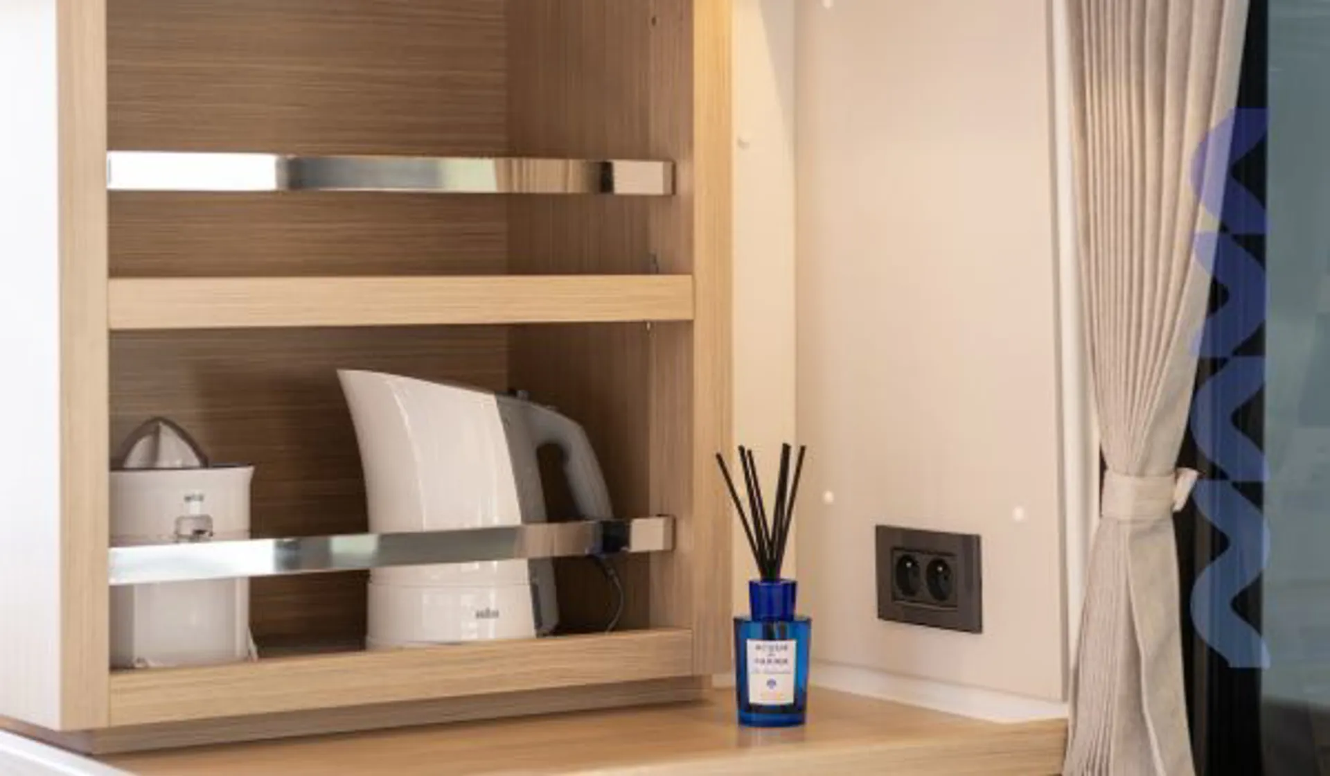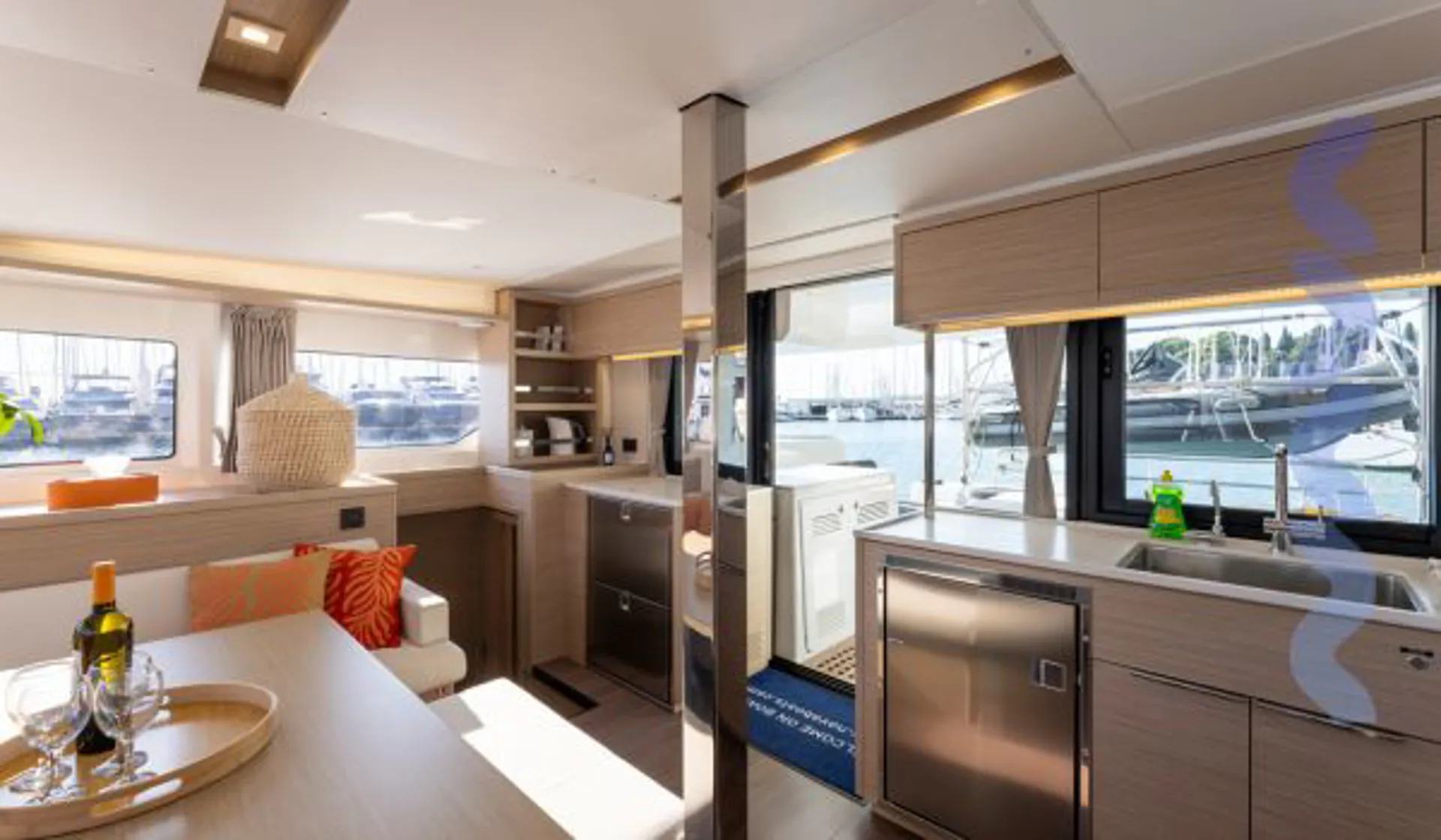 Inside, her Alpi Sand Oak cabinetry and Dark Oak flooring create a bright, contemporary feel. Features include full air-conditioning, LED mood lighting, a convertible saloon berth, and premium Fusion sound. The galley is fully equipped with multiple fridges, freezers, a 4-burner stove, oven, dishwasher, and a cockpit ice-maker.