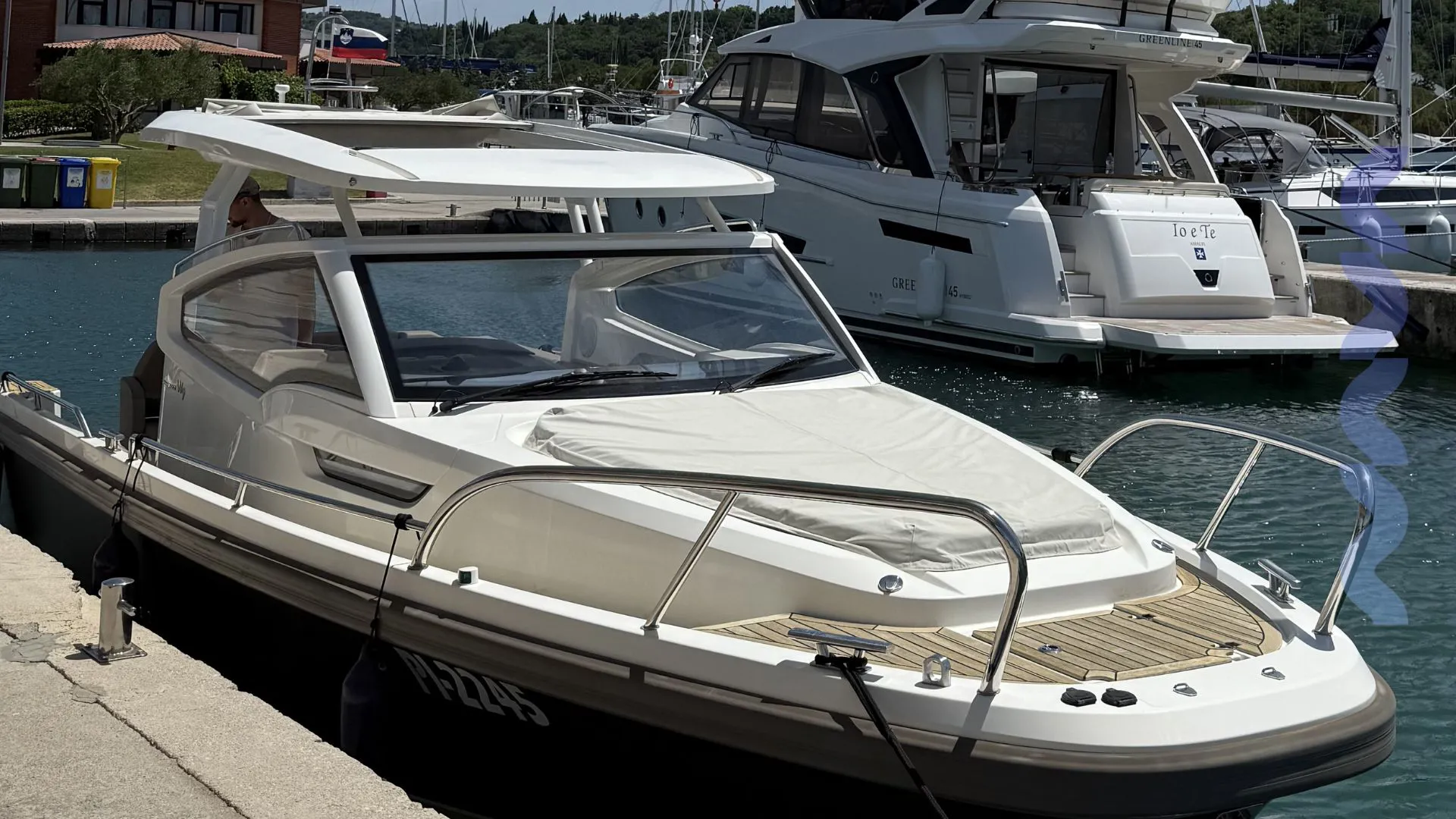 This Nimbus W9 is a meticulously maintained motor yacht, combining elegant Scandinavian design with high-performance offshore cruising. The hull is grey Oracal Graphit Metallic foil, and the deck and cockpit are fully laid with teak. The T-Top features an electrical canvas roof system with enclosed canopy for comfort and protection.