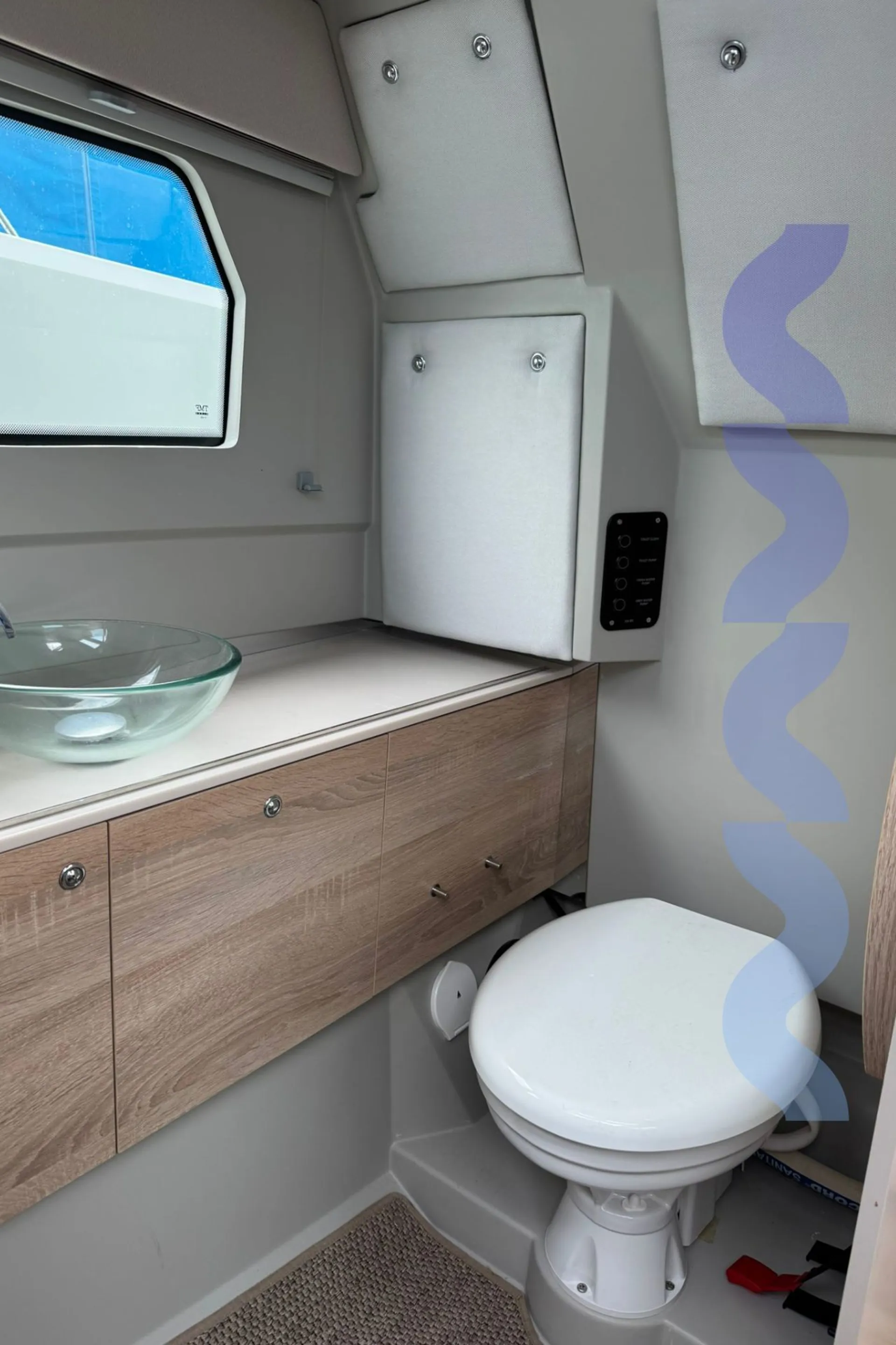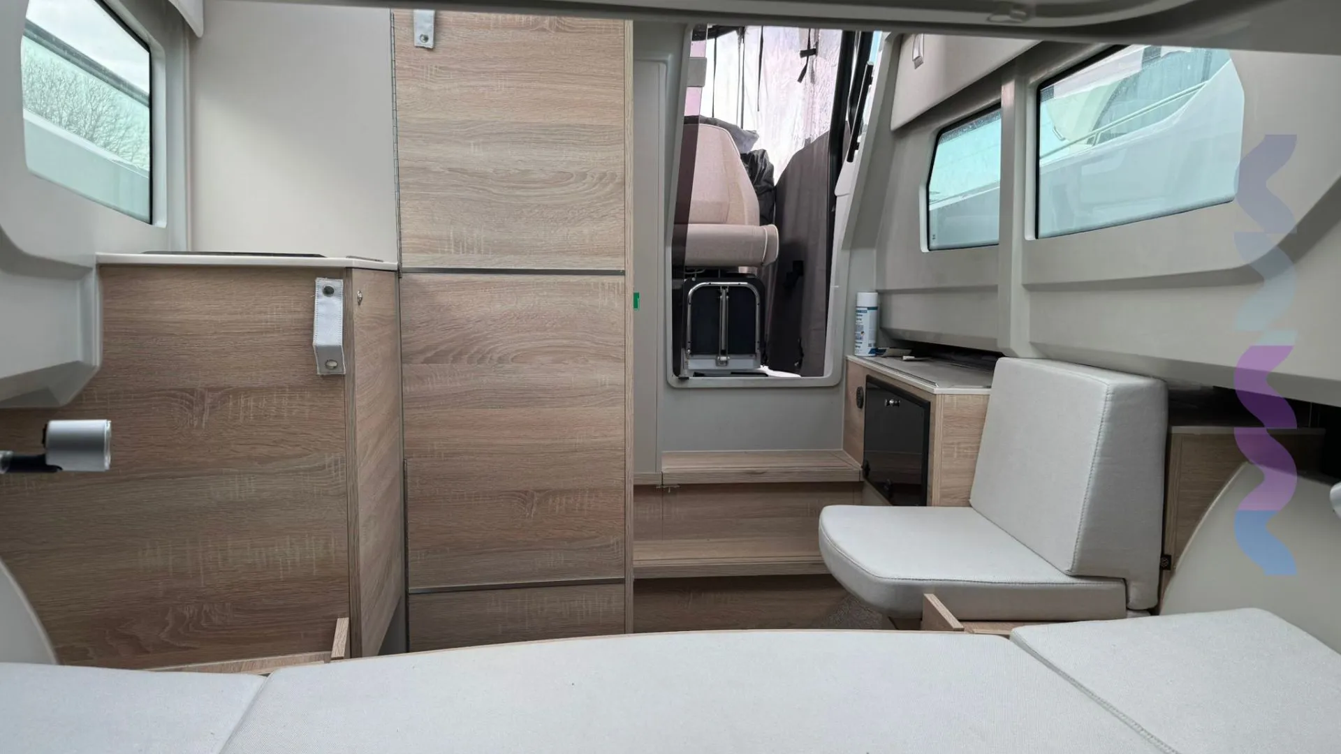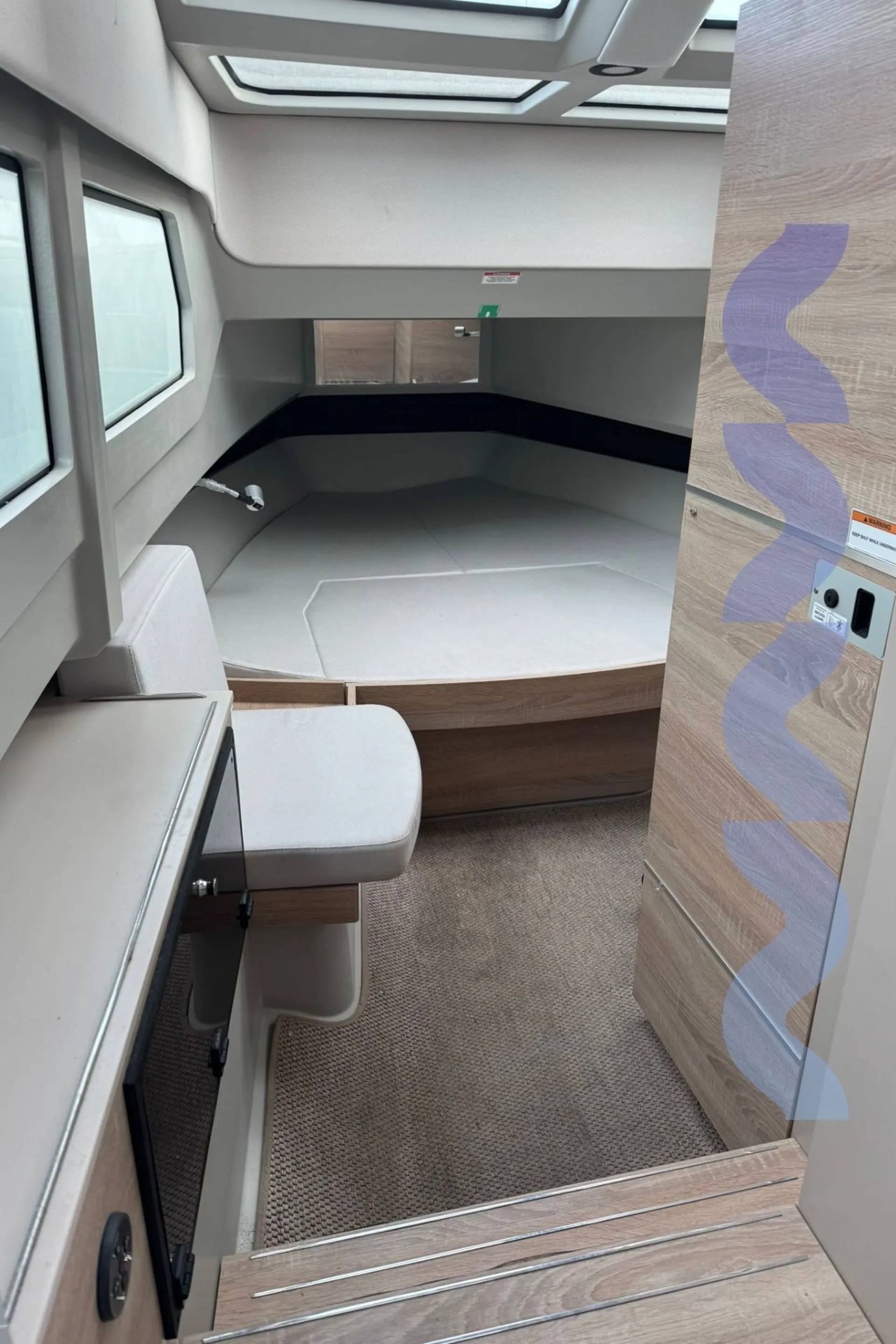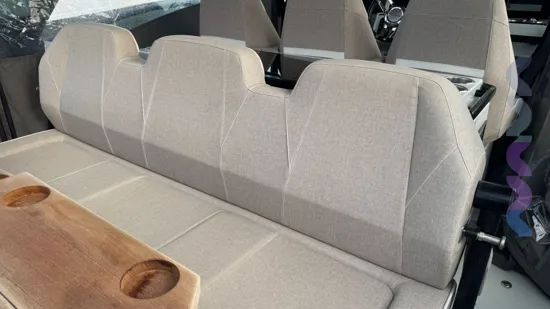 Finished in elegant “Coffee with Cream” upholstery (dark beige with light stitching), this vessel offers a luxurious and inviting atmosphere both on deck and below. The specification includes the Information Display & Entertainment Package, toilet and freshwater upgrade, automatic trim tabs, bow thruster, and catapult bow windlass with 40 m chain.