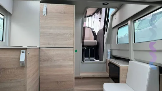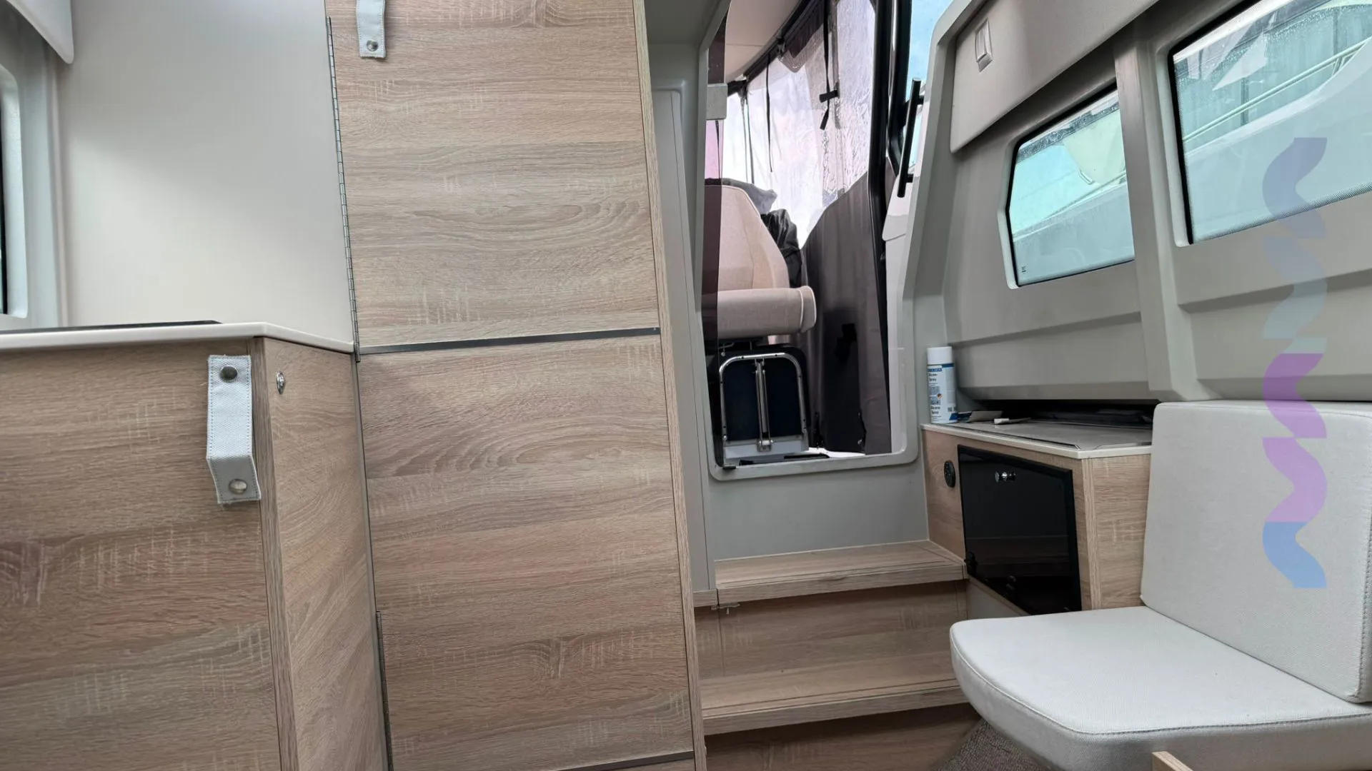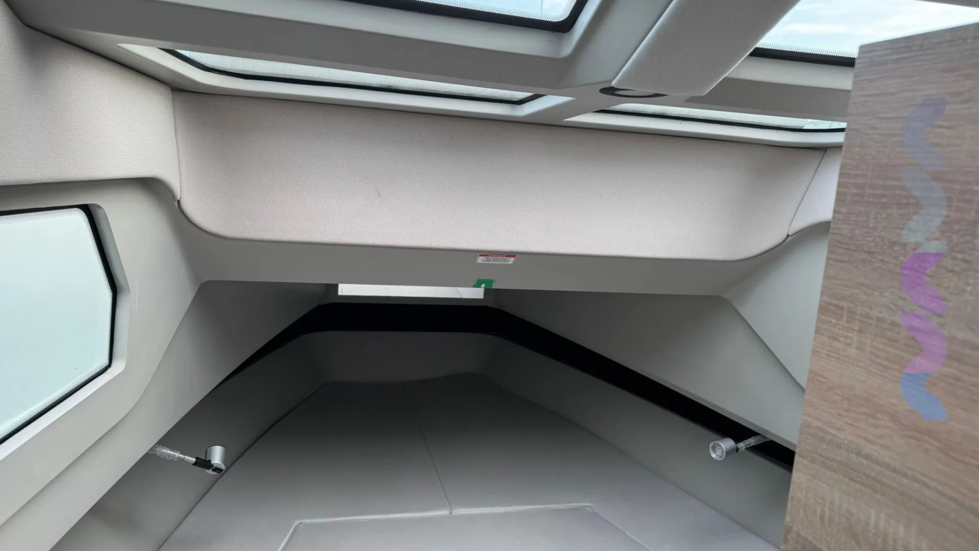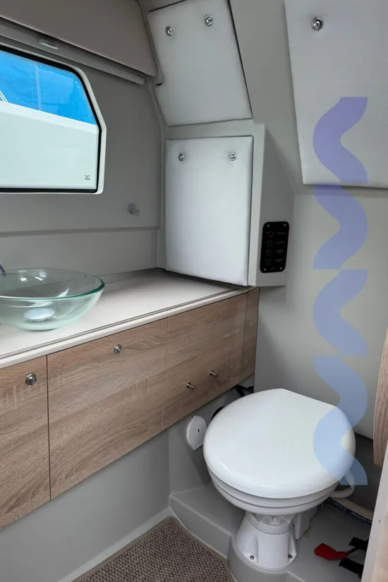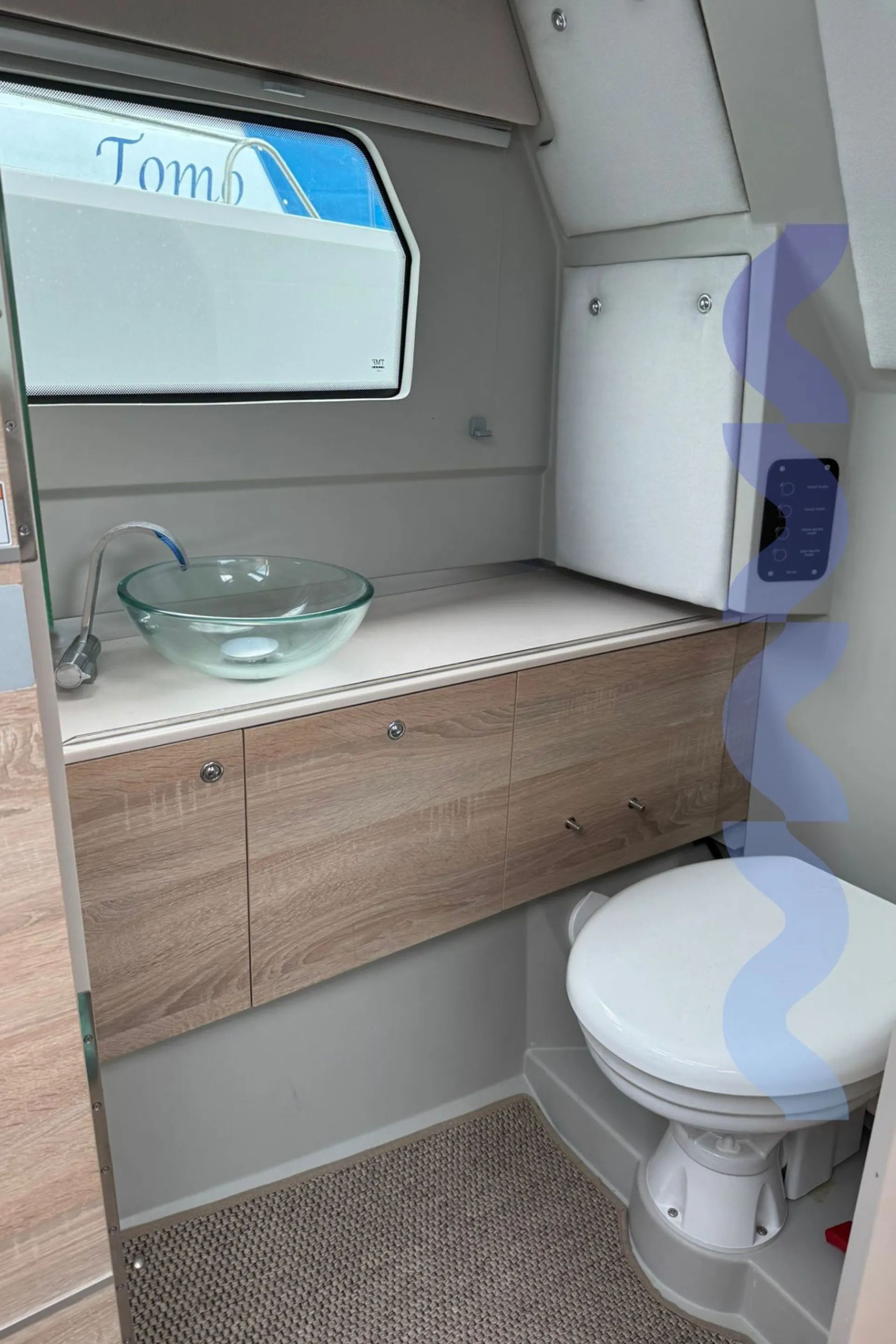 Finished in elegant “Coffee with Cream” upholstery (dark beige with light stitching), this vessel offers a luxurious and inviting atmosphere both on deck and below. The specification includes the Information Display & Entertainment Package, toilet and freshwater upgrade, automatic trim tabs, bow thruster, and catapult bow windlass with 40 m chain.