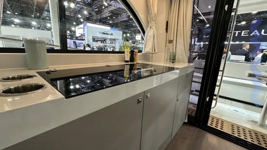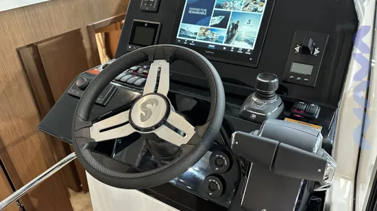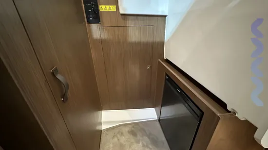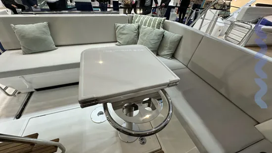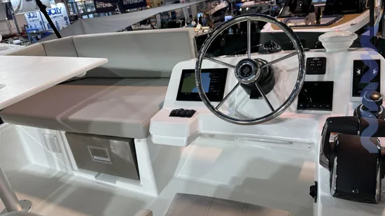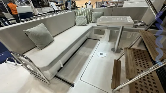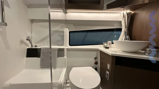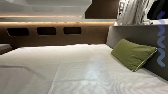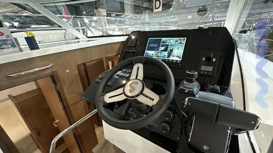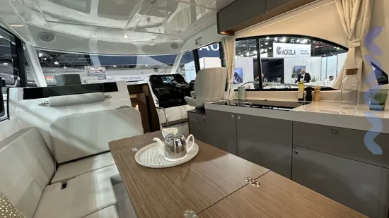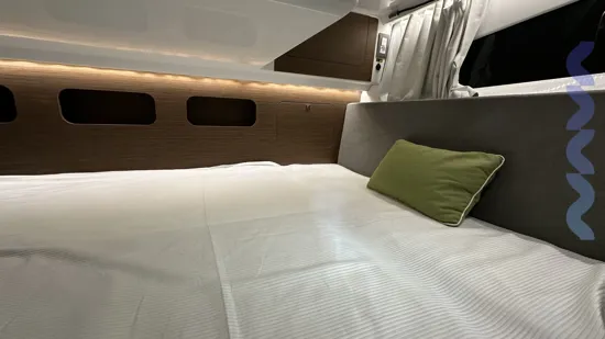 The spacious flybridge is perfect for relaxation and socializing, offering two facing seating benches, large sunpads, and panoramic views. The cockpit and flybridge provide ample outdoor living space for family and friends, while the many windows and trifold sliding doors flood the interior with natural light.