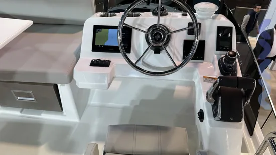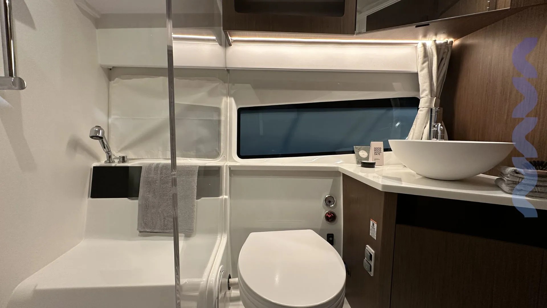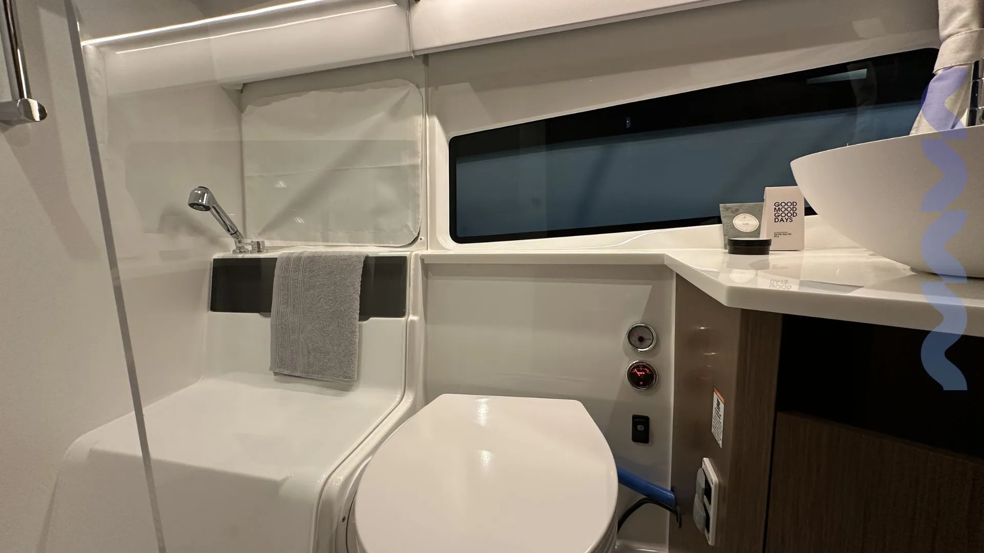 Inside, the layout comfortably accommodates up to 7 people, featuring a master cabin, a guest cabin with a double and single berth, and a convertible berth in the salon. High-quality finishes, practical storage, and modern equipment, including air conditioning, refrigerators on both the flybridge and lower deck, and a 220V electrical circuit, ensure comfort during every journey.