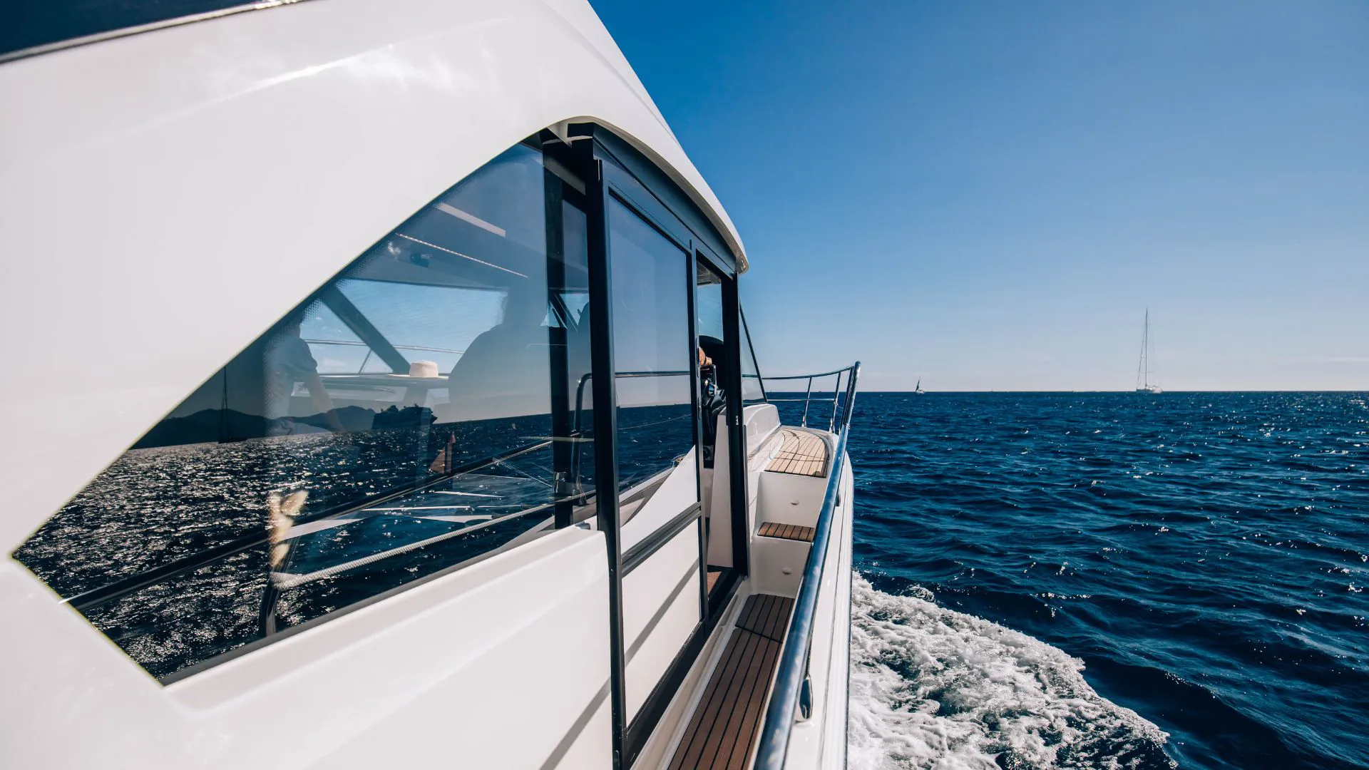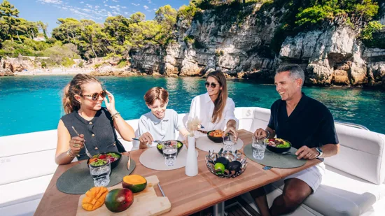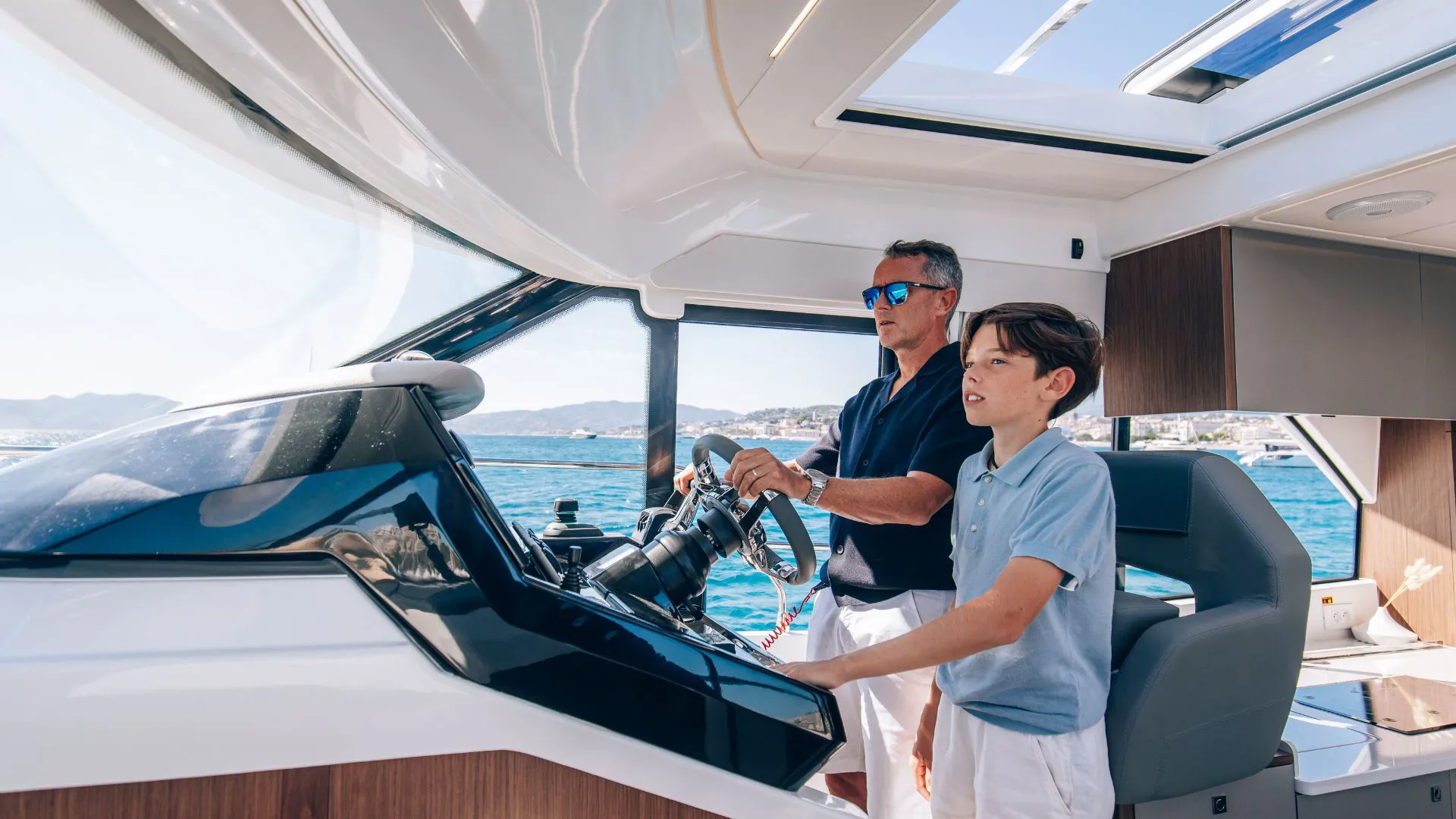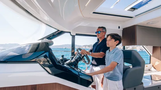 The bright wheelhouse features panoramic views, a sliding side window, indirect LED interior lighting, and a 144 L stainless-steel double-drawer refrigerator. Entertainment is provided by the Fusion MS-RA670 sound system with six premium speakers.