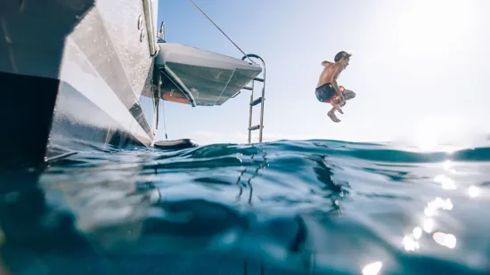 Comfort on board is enhanced by air conditioning (36,000 BTU), diesel generator 9 kVA, inverter 12/230V, additional 80 L fridge, and ceramic hob.