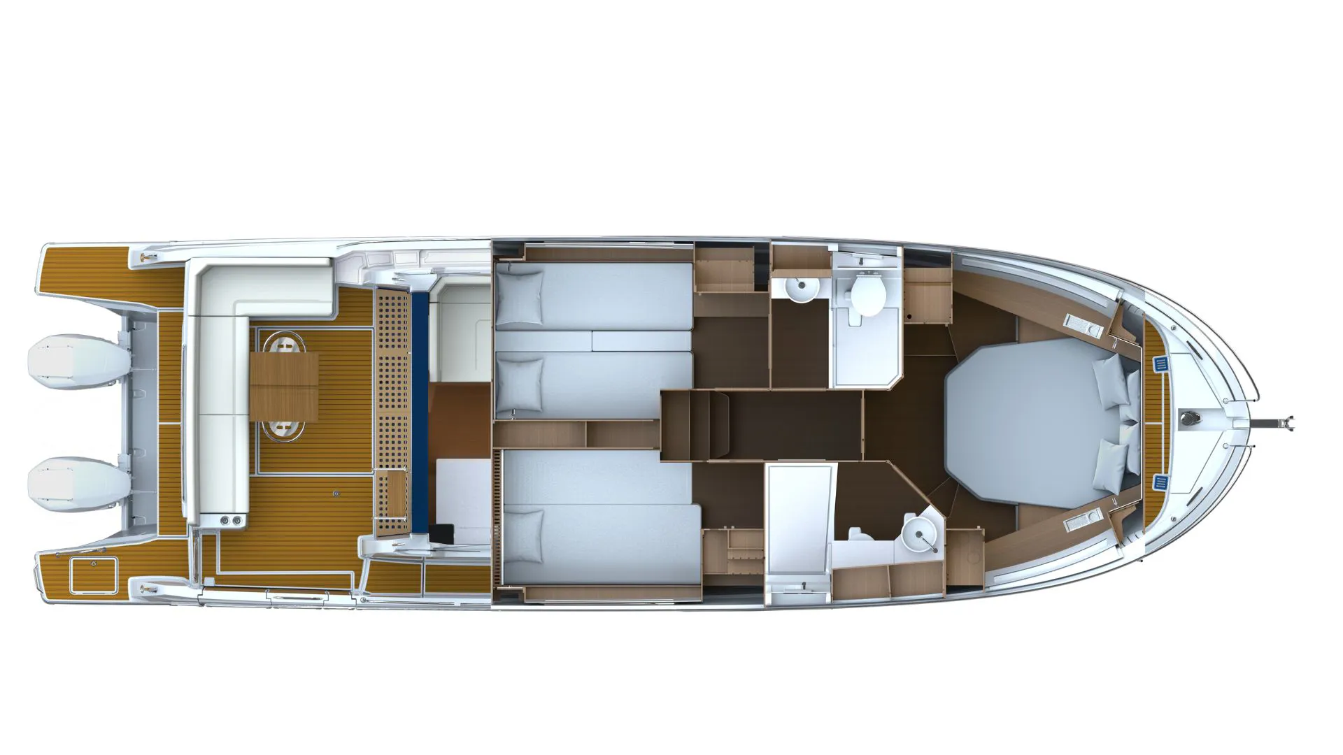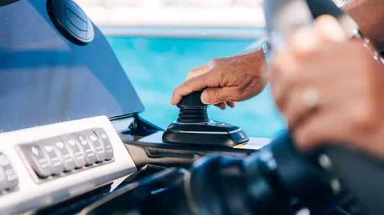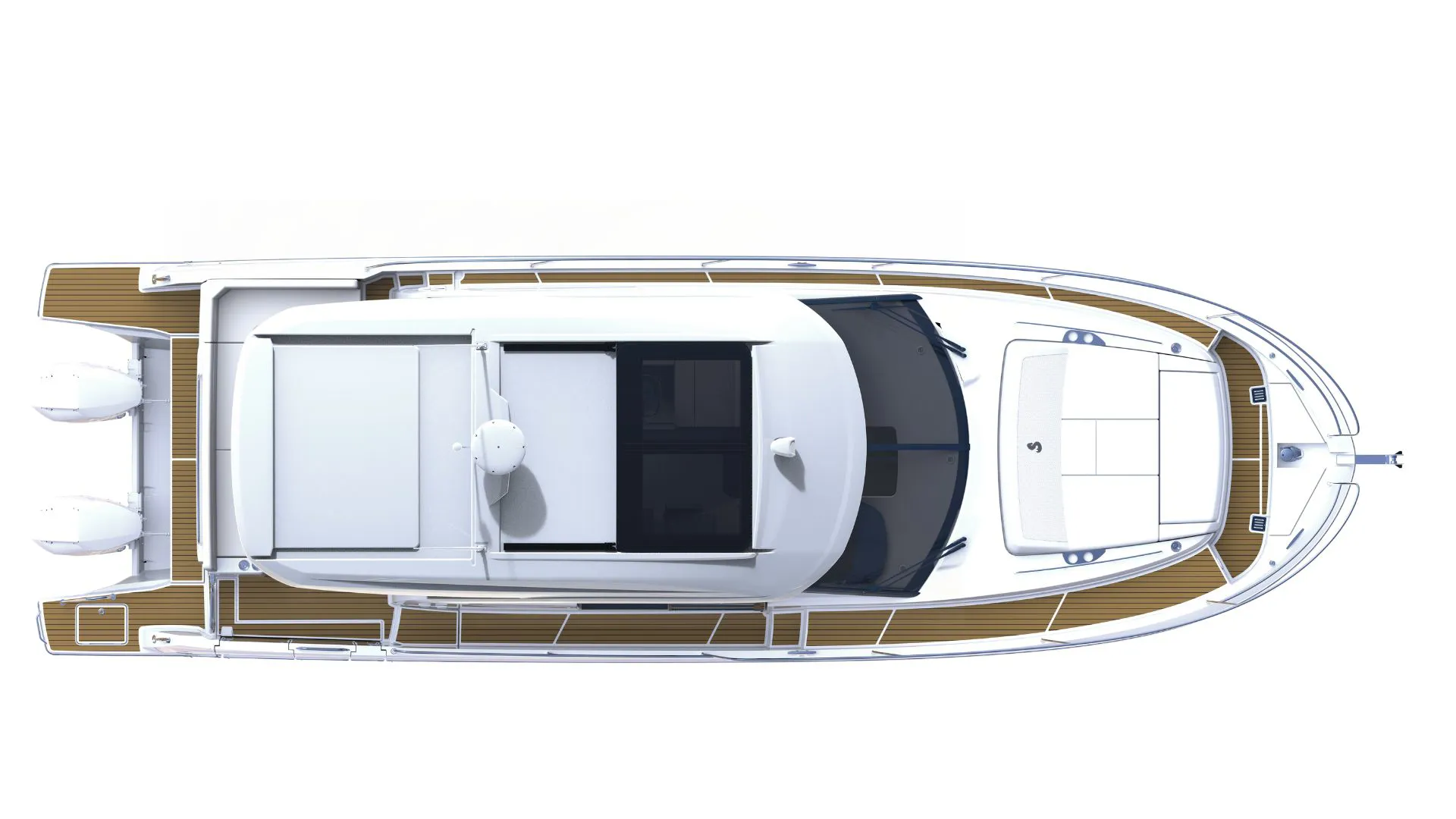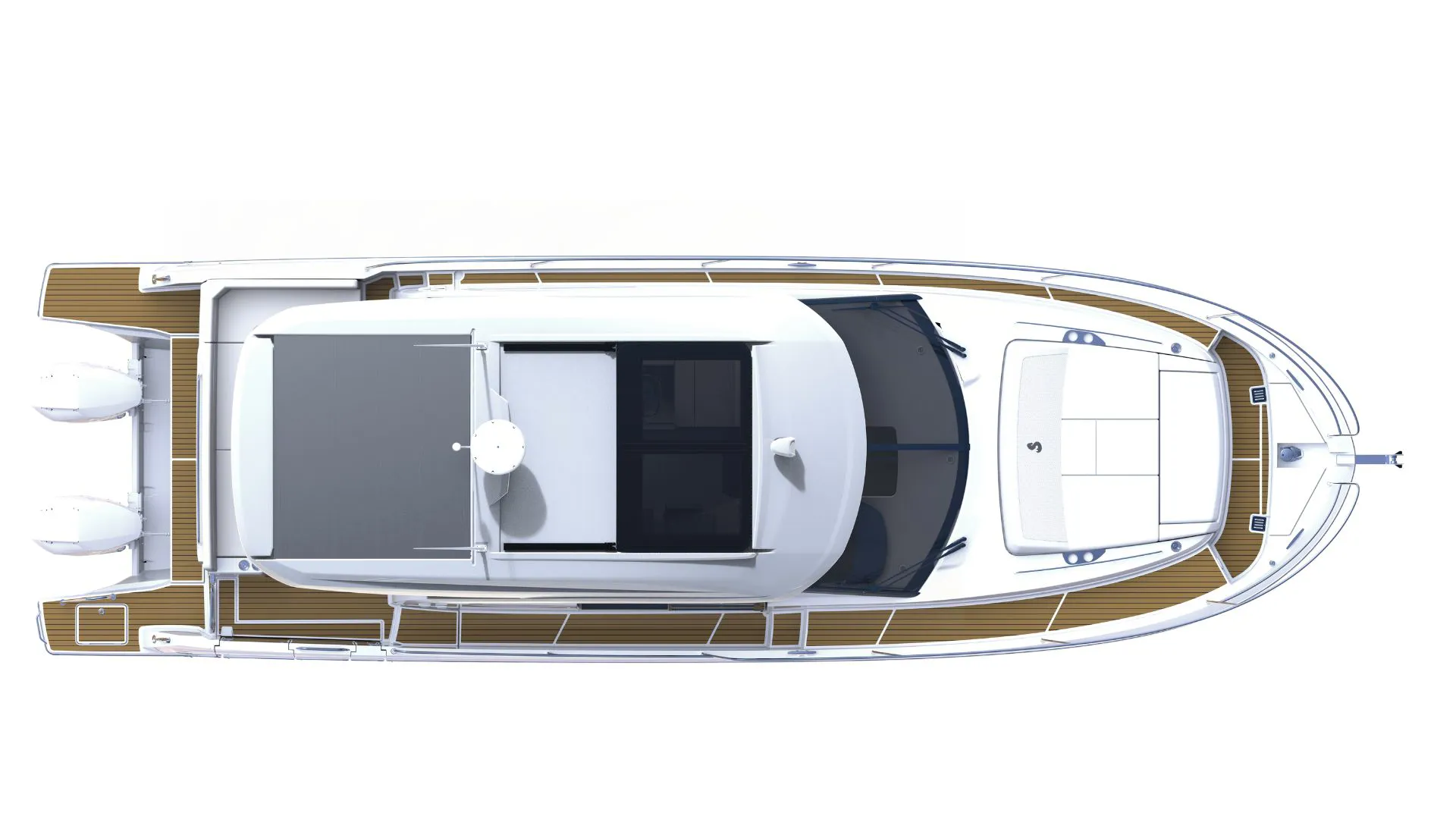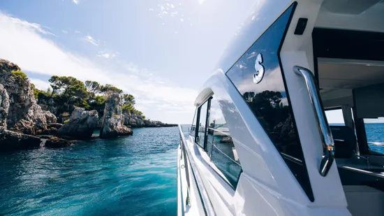 Powered by twin Mercury 400 XL Cold White outboards with joystick control, the boat ensures smooth handling and easy maneuvering in marinas. A bow thruster and Zipwake automatic trim system further enhance stability and control.