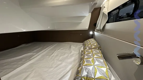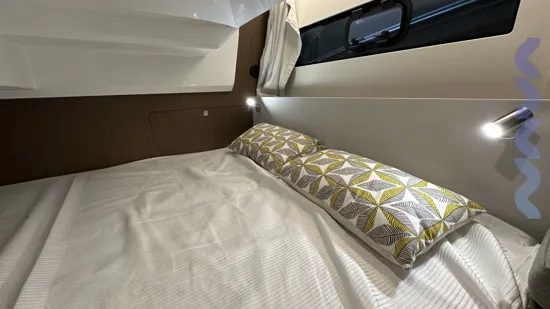 The boat features a forward owner’s cabin with a queen-size bed, a guest cabin for two, and a convertible saloon, offering accommodation for up to 6 people.