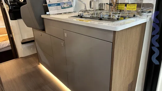 The bright saloon with large panoramic windows provides plenty of natural light, while the galley is equipped with an 80 L refrigerator, electric hob, and ample storage.