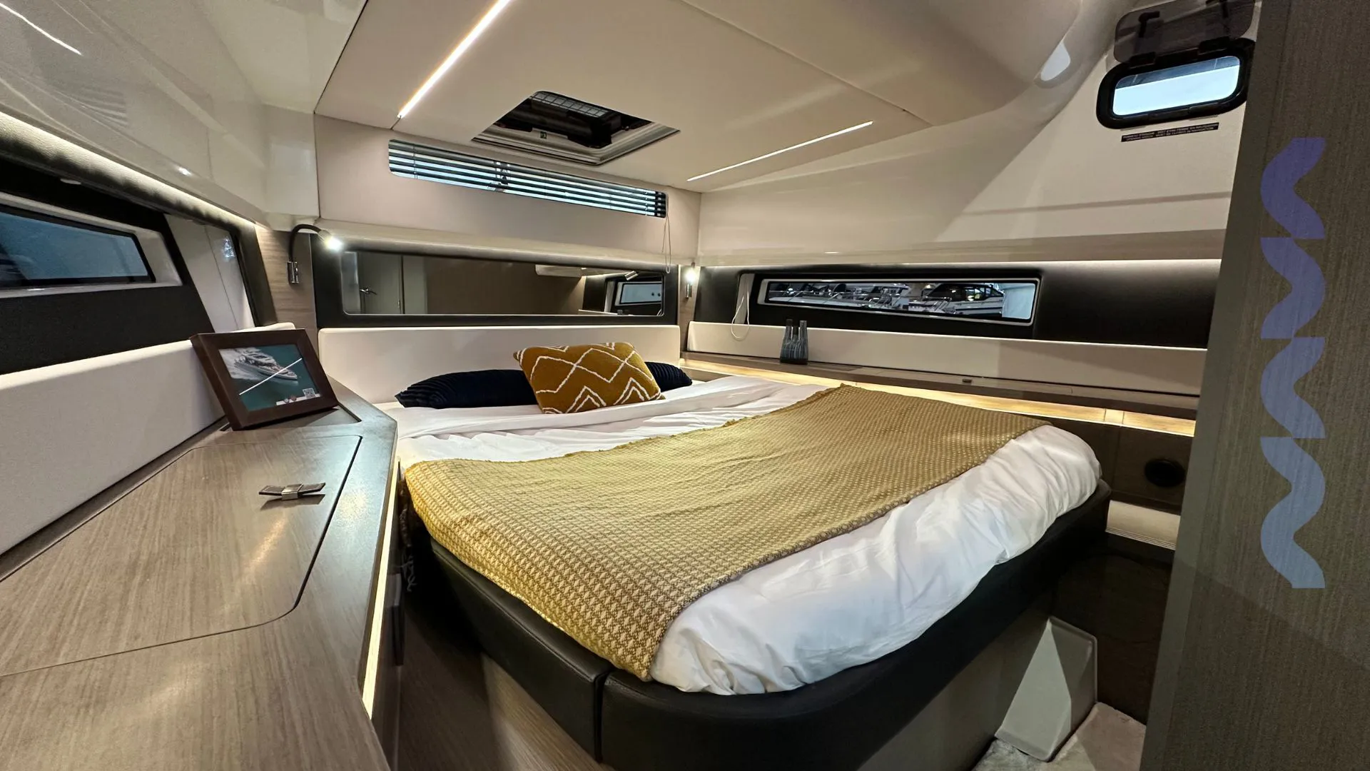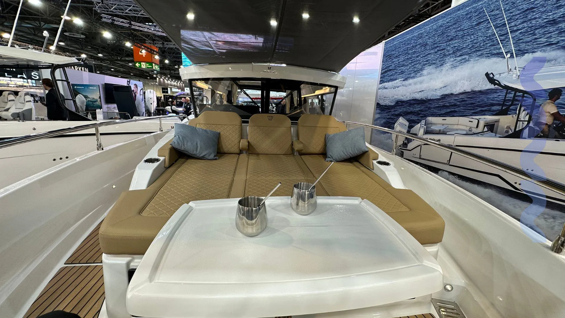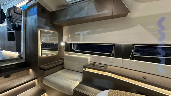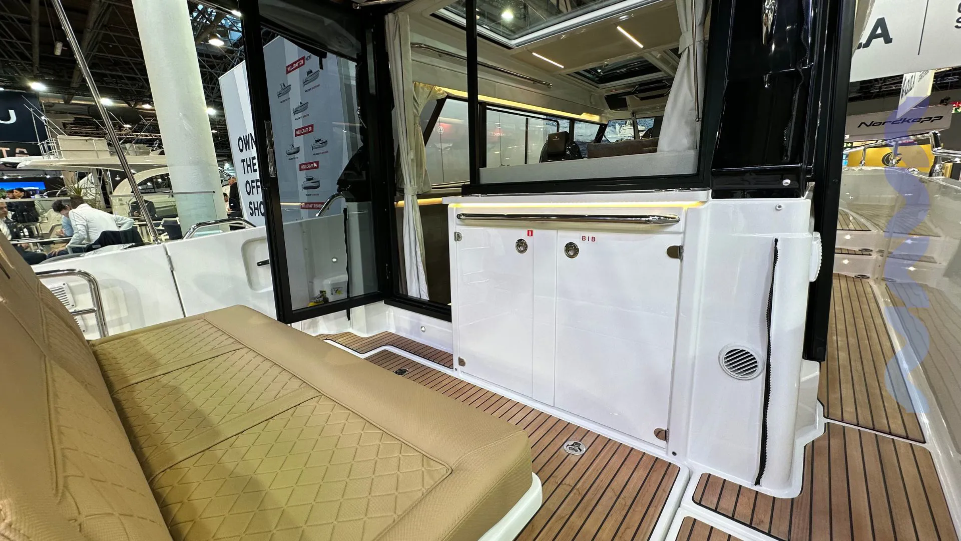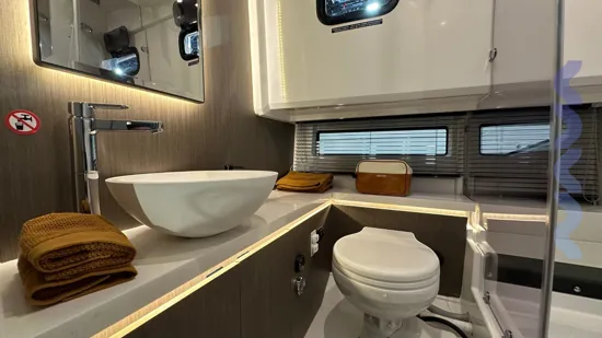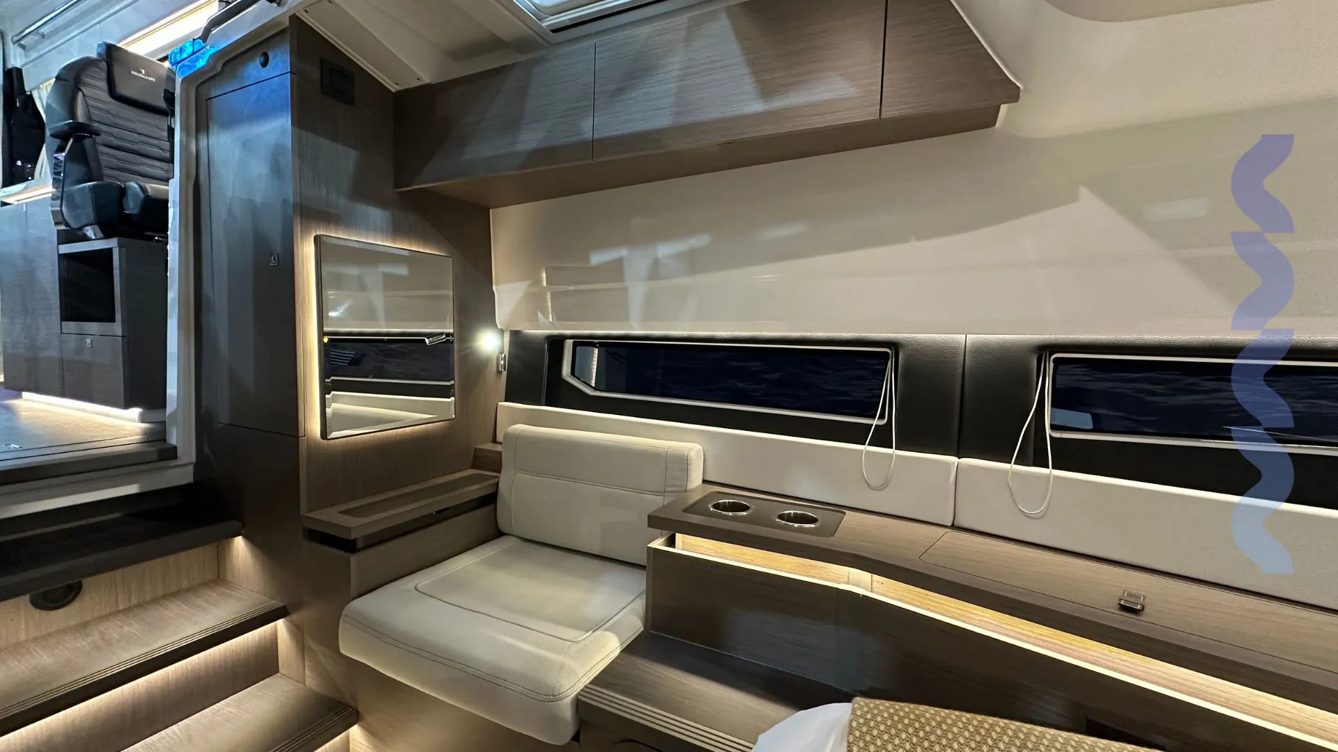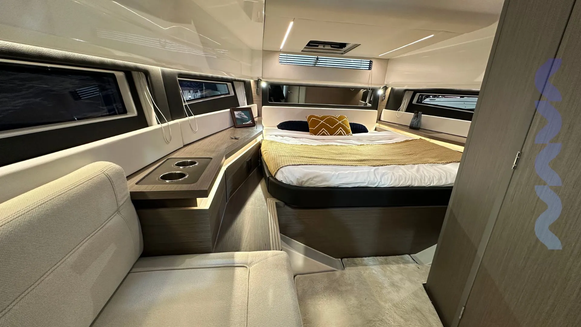 Outdoor life is equally exceptional: aft cockpit bench, bow and aft sun decks, cockpit enclosures, teak decking on swimming platforms, GRP bow tables, roof racks, and bow sunshade create an inviting and practical space for entertainment and relaxation. Optional features like a gyro stabilizer, air conditioning, and lithium power system add maximum comfort and stability.