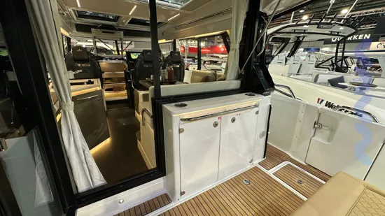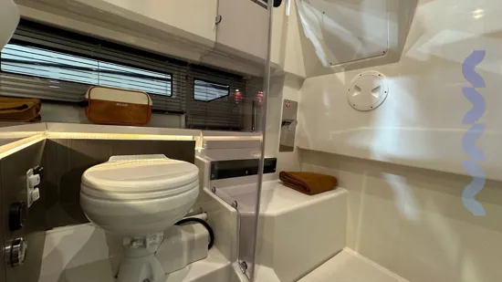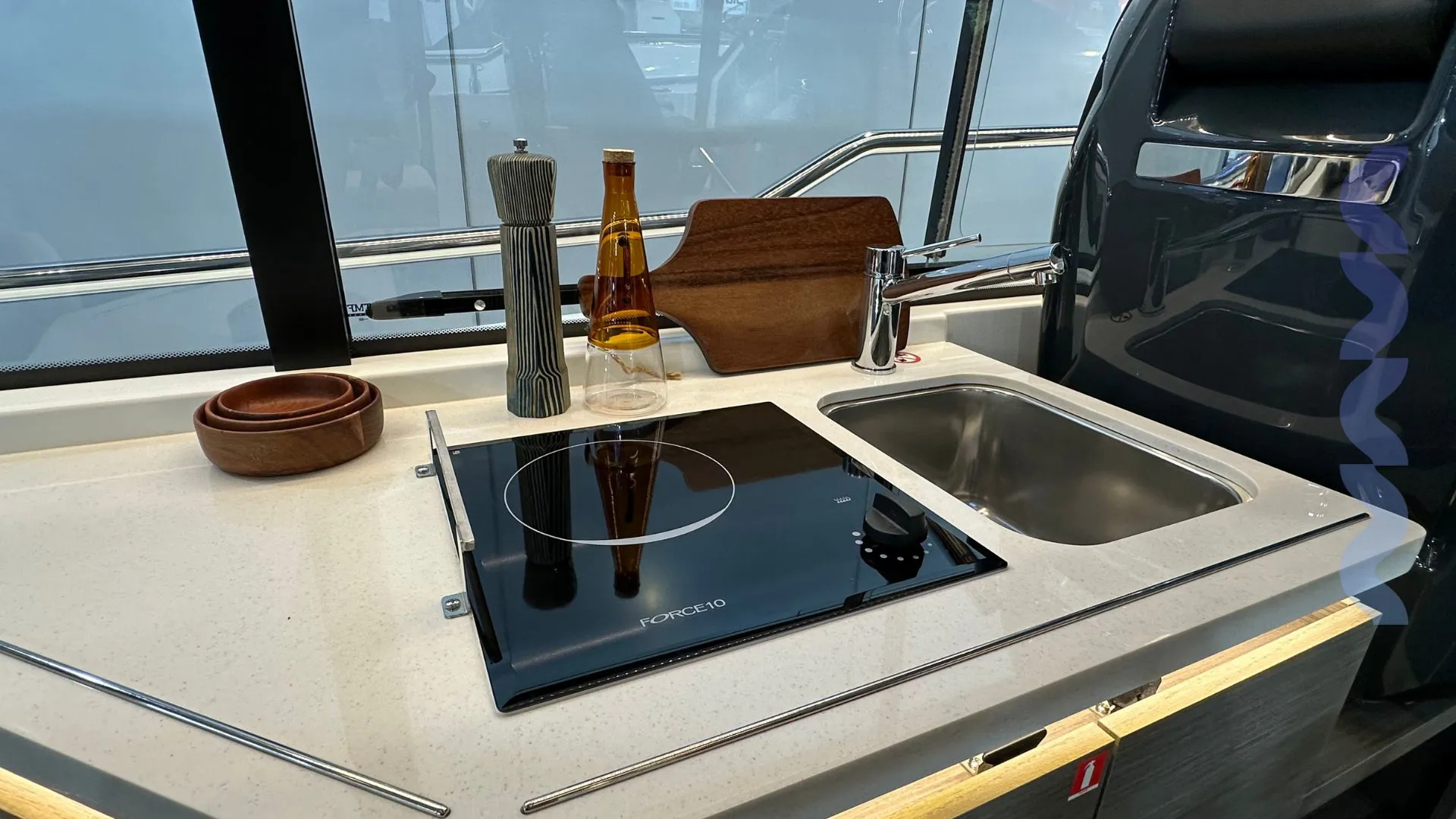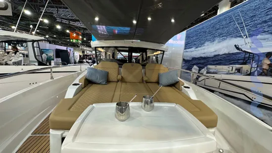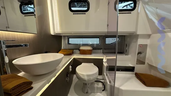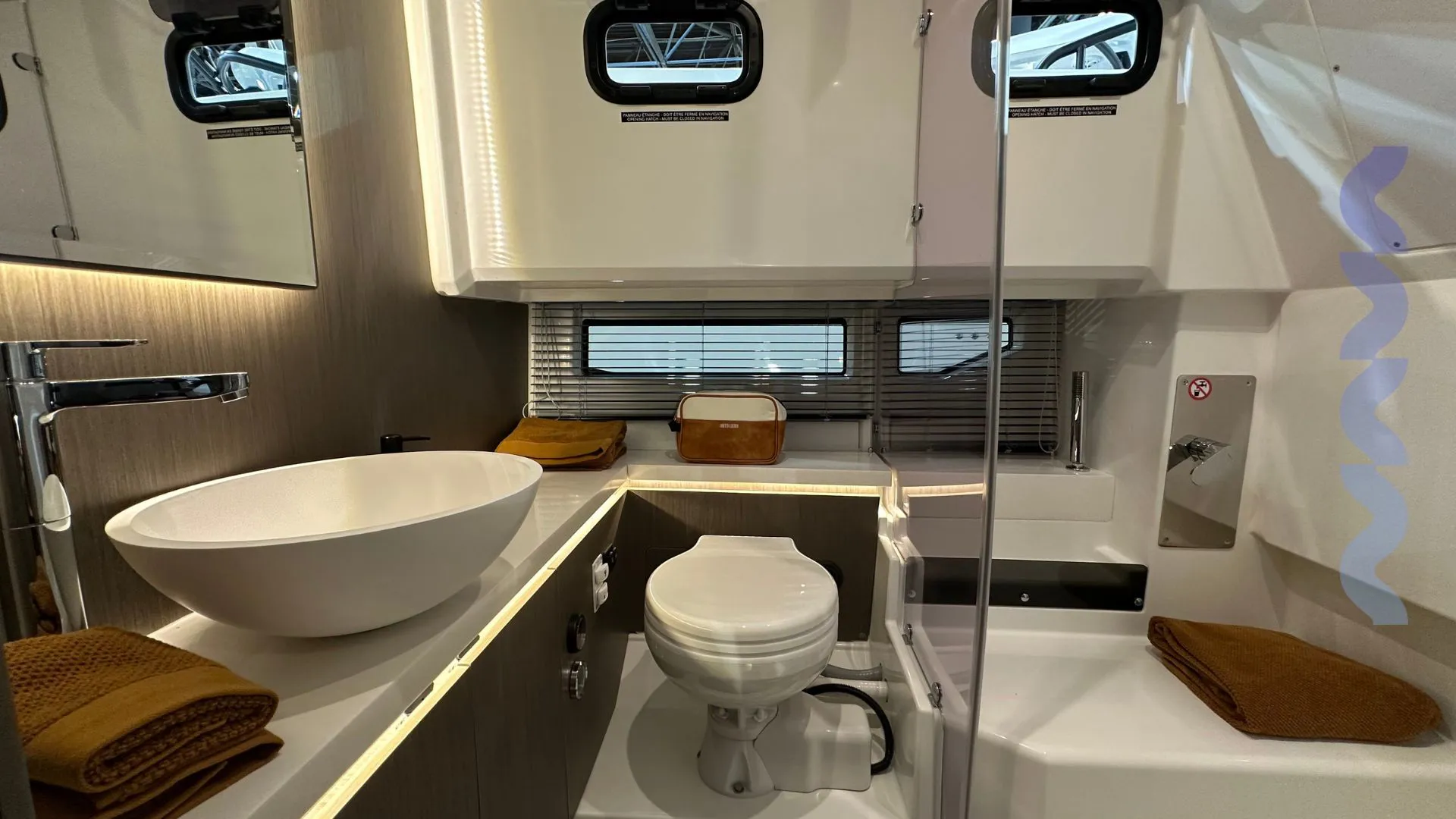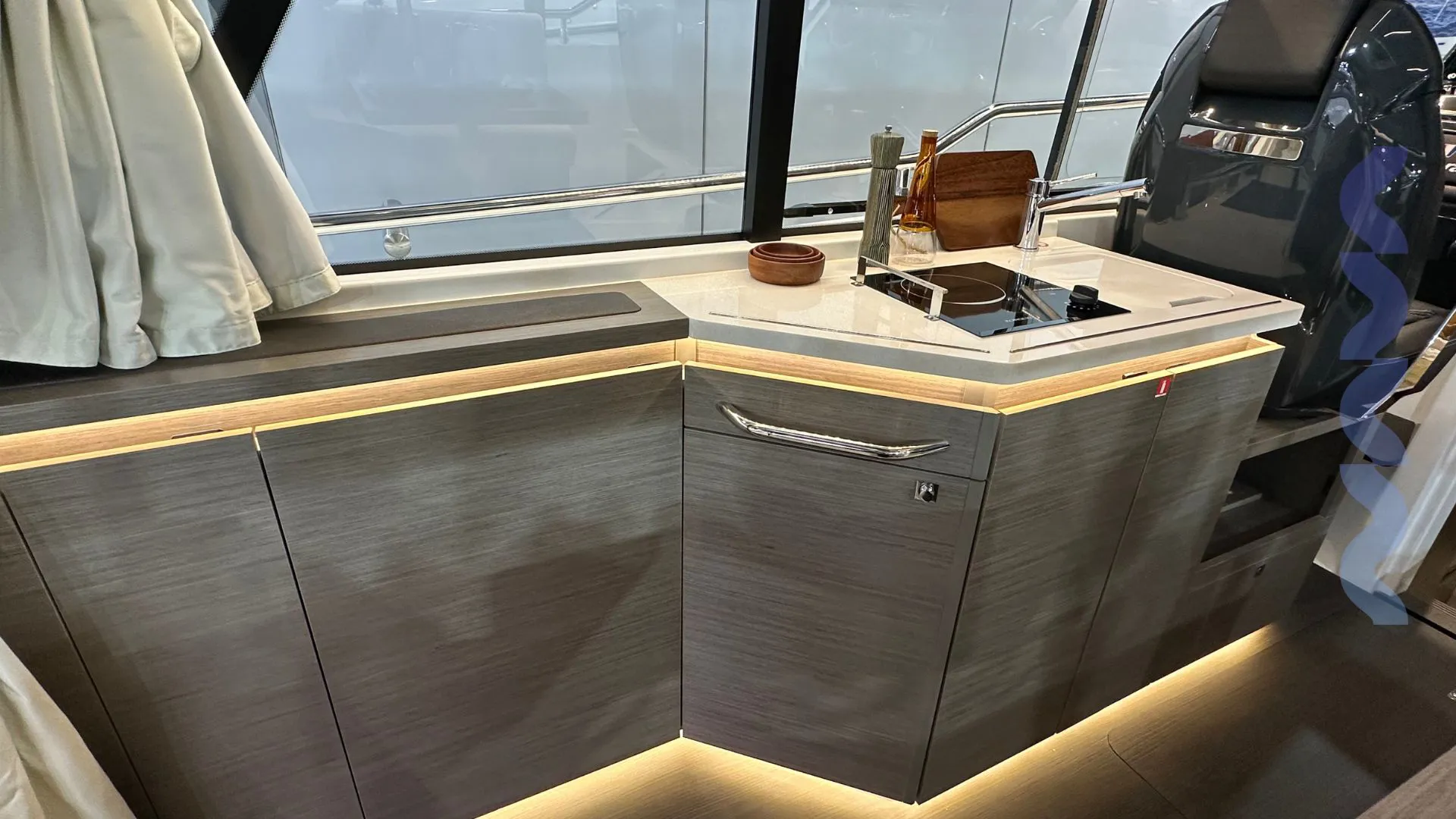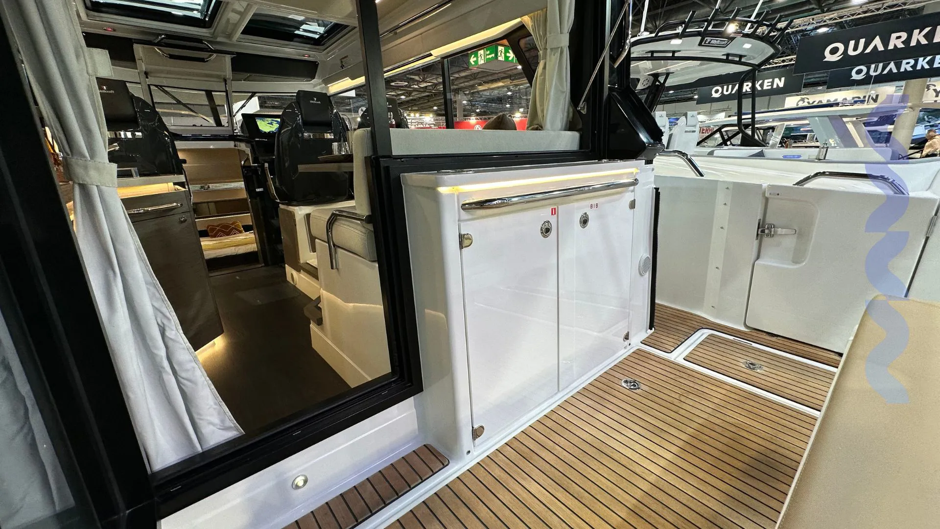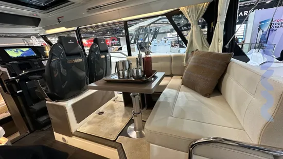 Outdoor life is equally exceptional: aft cockpit bench, bow and aft sun decks, cockpit enclosures, teak decking on swimming platforms, GRP bow tables, roof racks, and bow sunshade create an inviting and practical space for entertainment and relaxation. Optional features like a gyro stabilizer, air conditioning, and lithium power system add maximum comfort and stability.