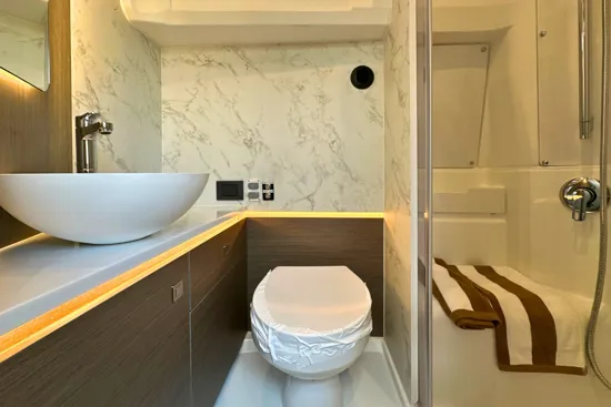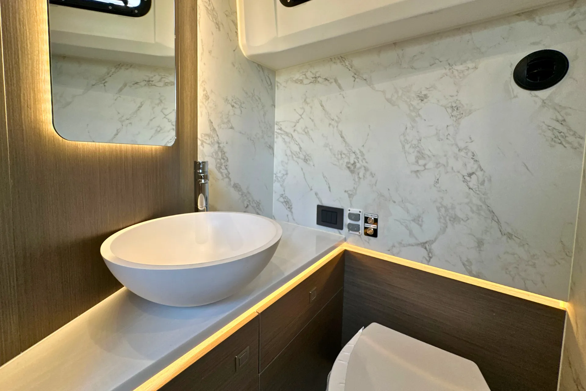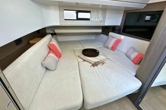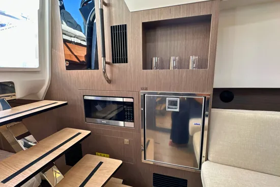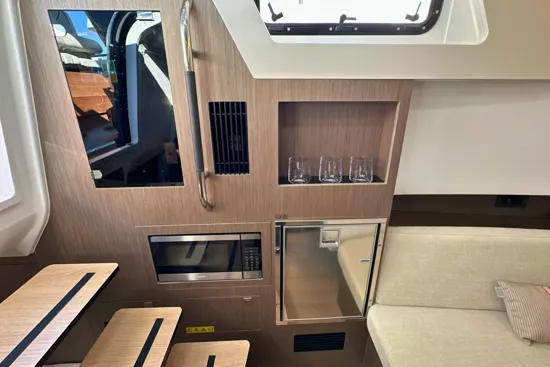 Below deck, smart layout meets style: a convertible forward berth, private mid-cabin, full galley, and a separate bathroom with shower make weekend cruising a breeze.