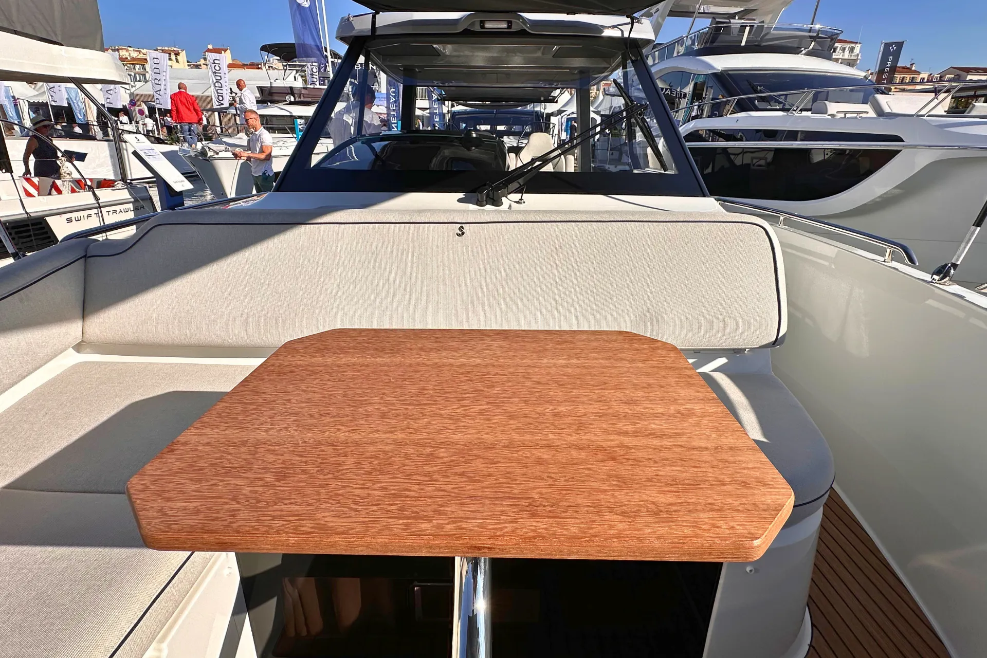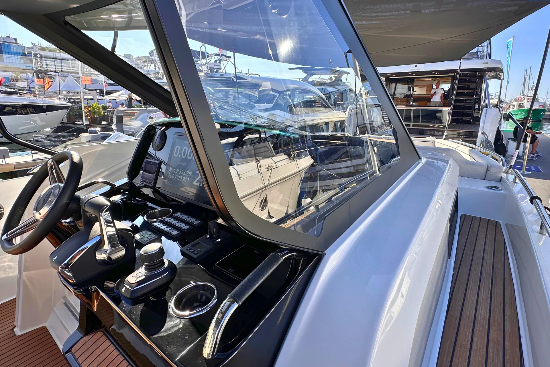 The cockpit is made for socializing and relaxing, with fold-out seating, a convertible sunpad, an outdoor galley, and drop-down side terraces that extend the swim platform—perfect for enjoying the water.