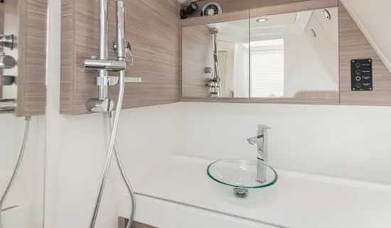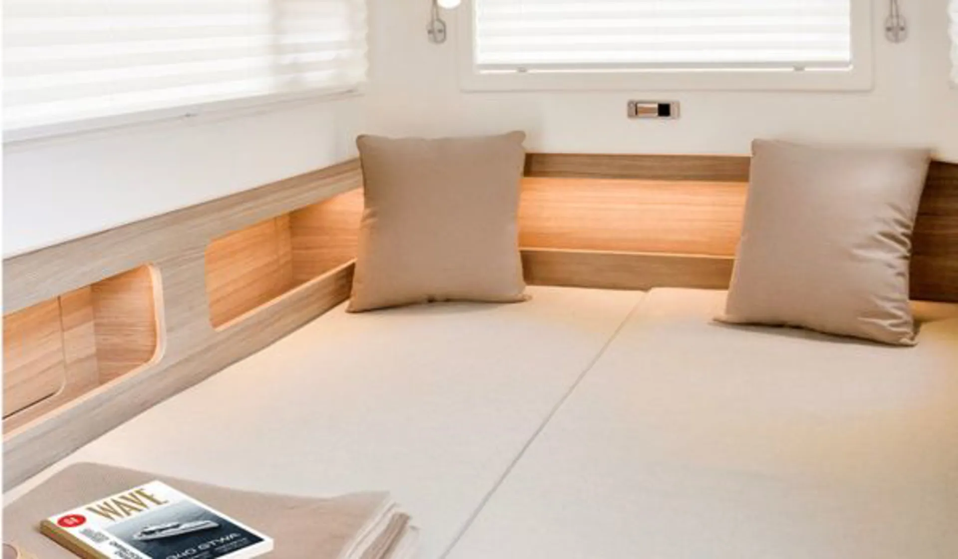 Luxury Below Deck: Forward double cabin, aft cabin for two, and separate toilet – all with large windows & natural light.