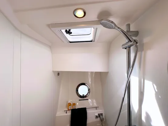 The interior is designed for relaxation and socializing, comfortably seating up to 8 people in the salon, while the three cabins ( master, twin, single cabin) accommodate 5 guests overnight. The sleek, modern layout features Alpi oak interiors, slatted oak doors, and Bolt Greige upholstery, creating a warm and inviting atmosphere.