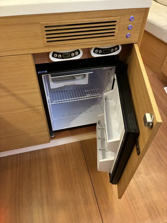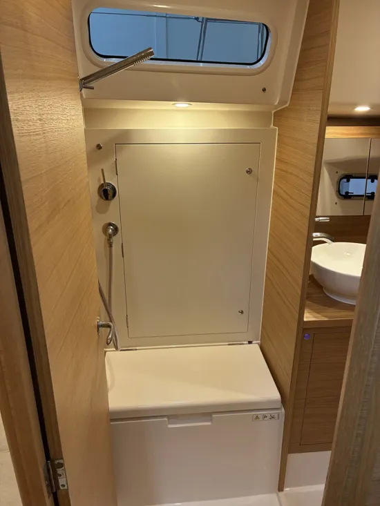 Below deck, discover Nordic Oak elegance, a two-cabin layout with Corian galley, Eberspächer heating, B&G navigation suite, and Fusion sound system.