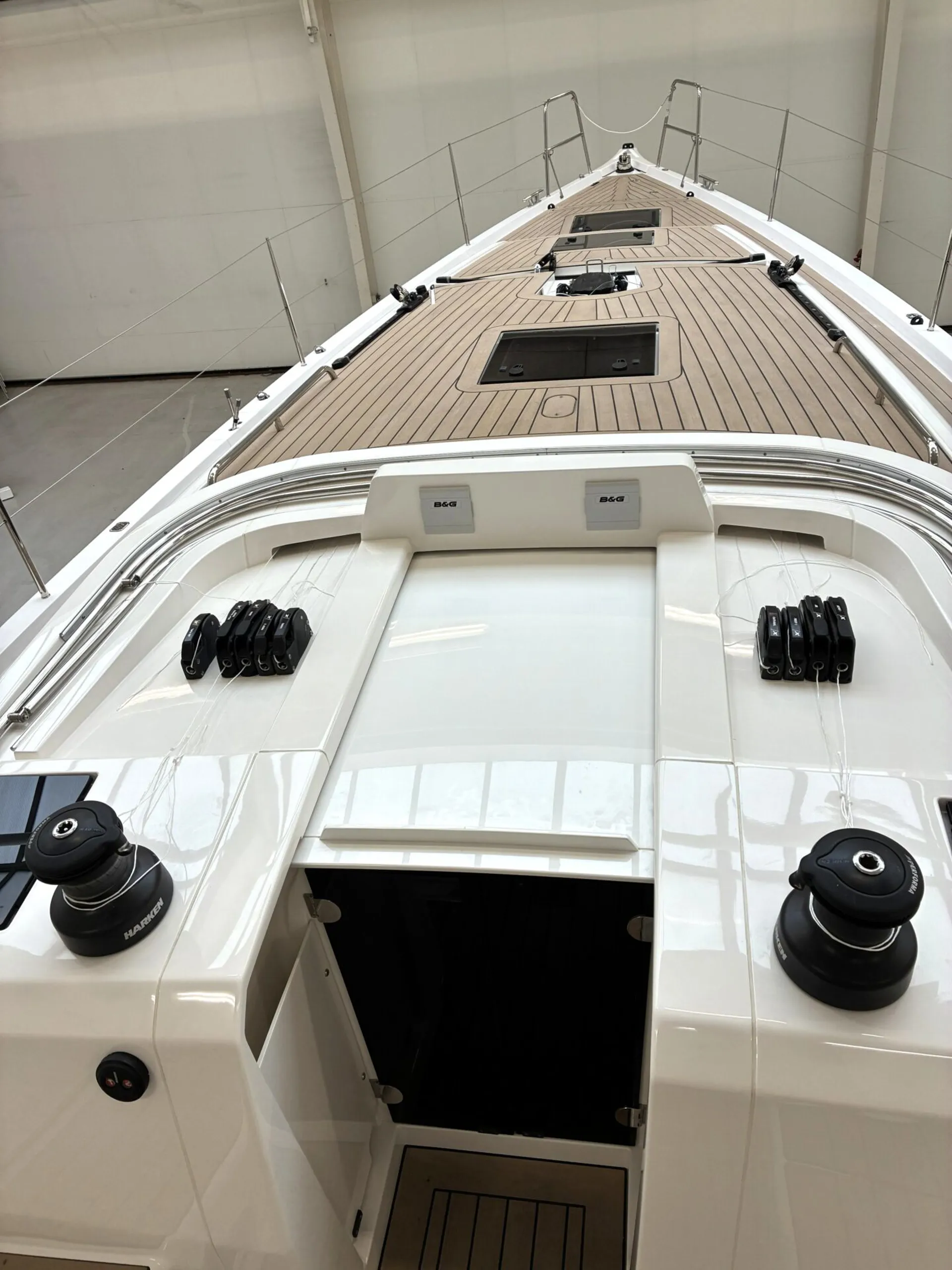 Her epoxy-infused hull ensures lightness, strength, and stiffness, while the galvanized steel keel structure provides unmatched safety and stability. The deck layout with electric Harken winches, self-tacking jib system, and retractable bow thruster guarantees easy maneuvering in any condition.