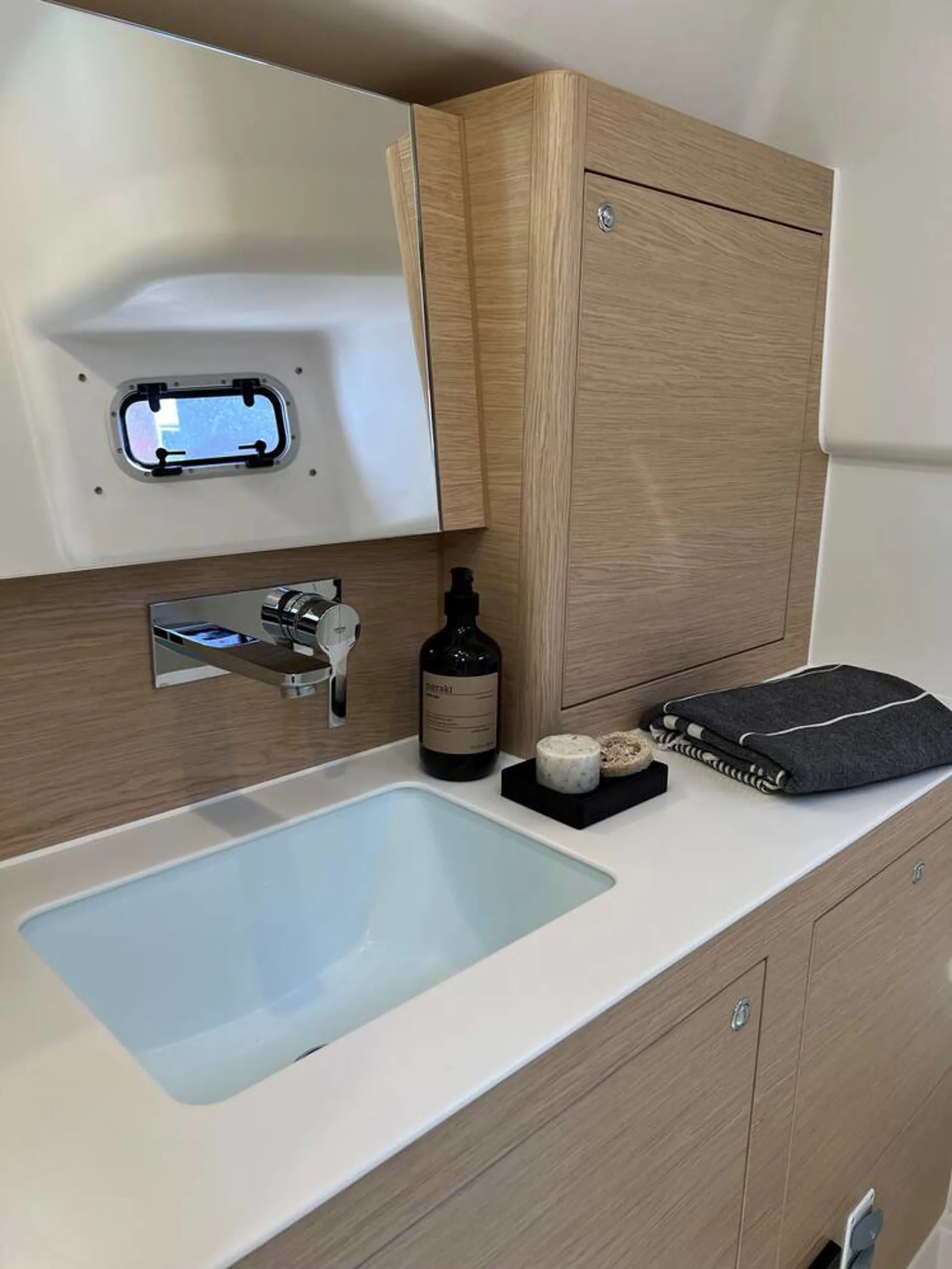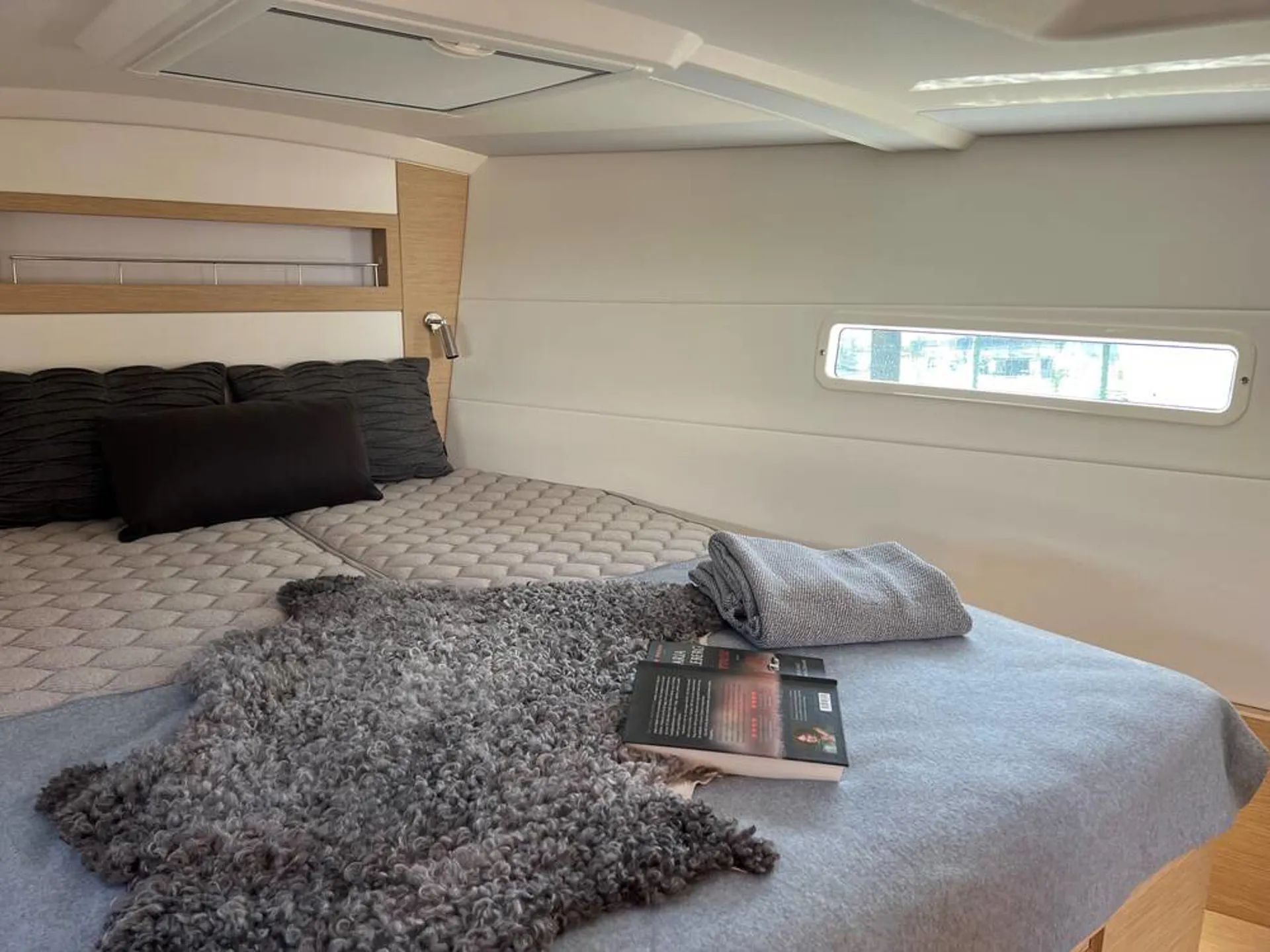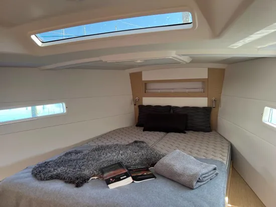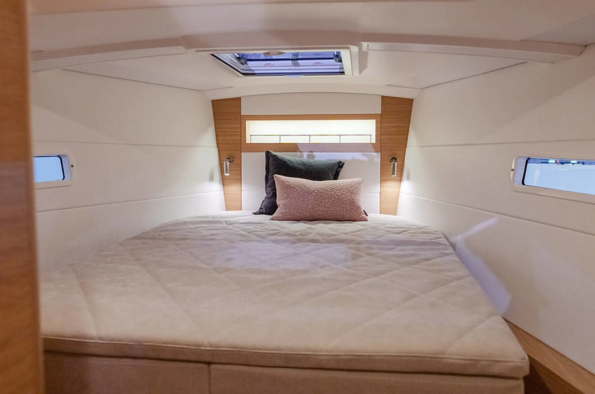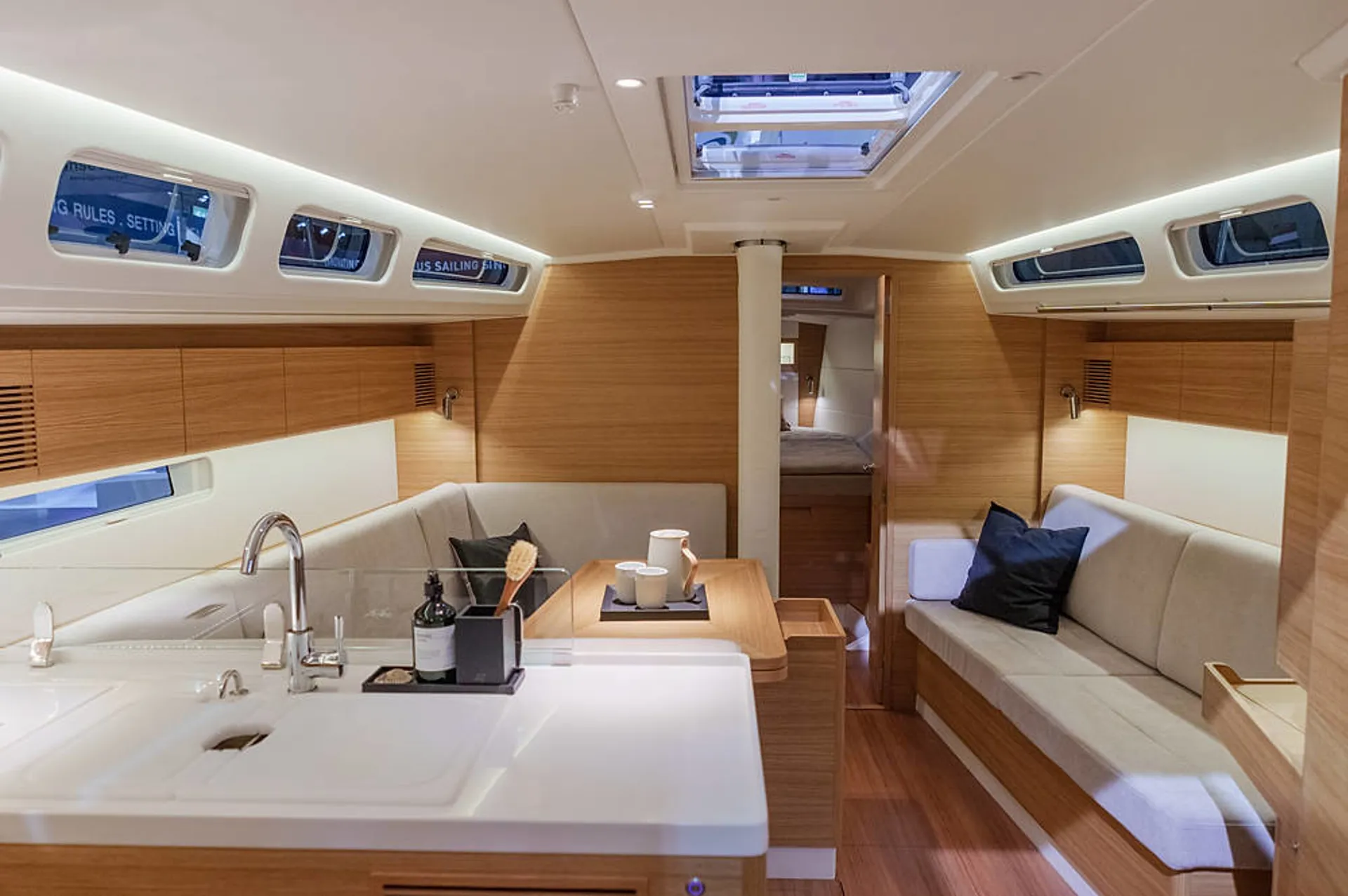 Built with vacuum-infused epoxy sandwich construction, the hull offers strength, safety, and durability, combined with a substantial keel and optimized sail plan for thrilling windward performance. Eleven fixed portlights and twelve openable hatches ensure light-filled, ventilated interiors, while six self-tailing winches manage halyards, genoa, and mainsheet with ease.