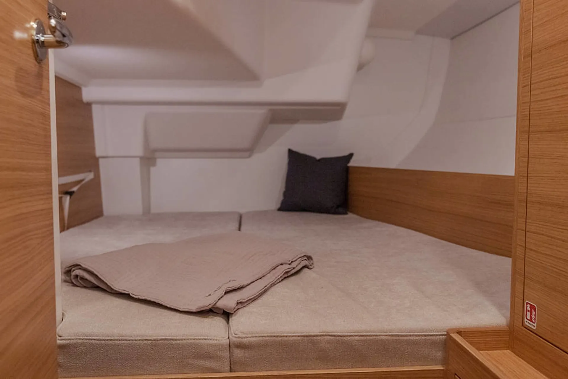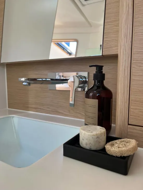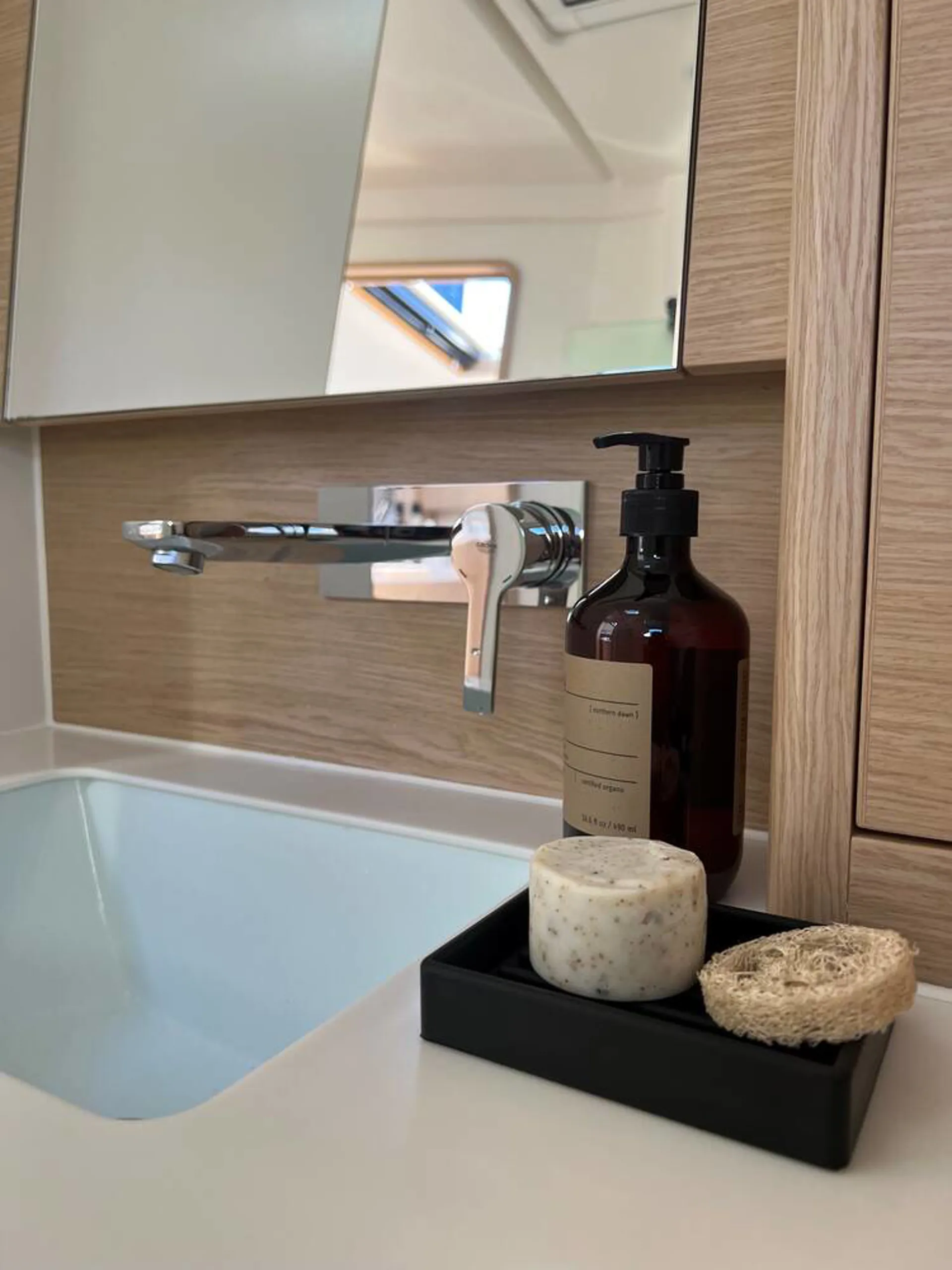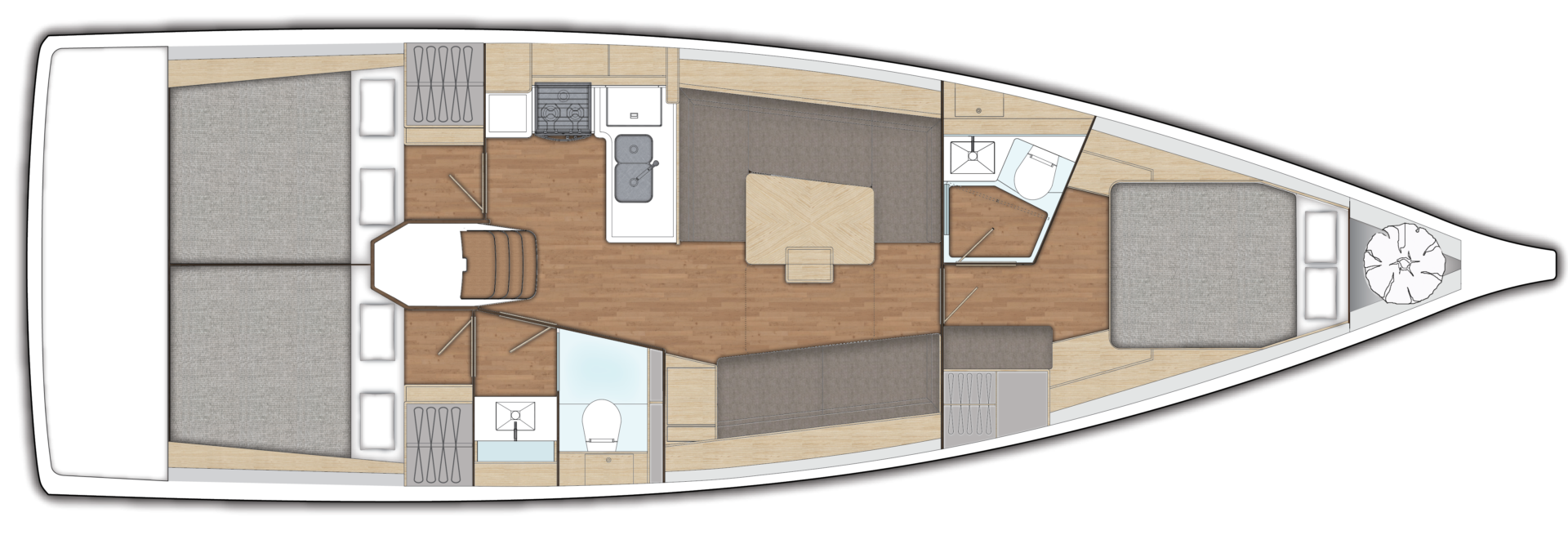 Built with vacuum-infused epoxy sandwich construction, the hull offers strength, safety, and durability, combined with a substantial keel and optimized sail plan for thrilling windward performance. Eleven fixed portlights and twelve openable hatches ensure light-filled, ventilated interiors, while six self-tailing winches manage halyards, genoa, and mainsheet with ease.